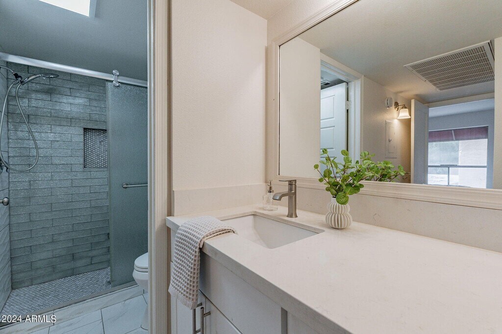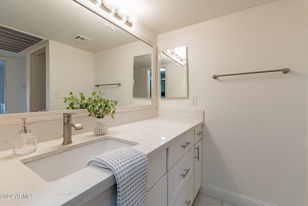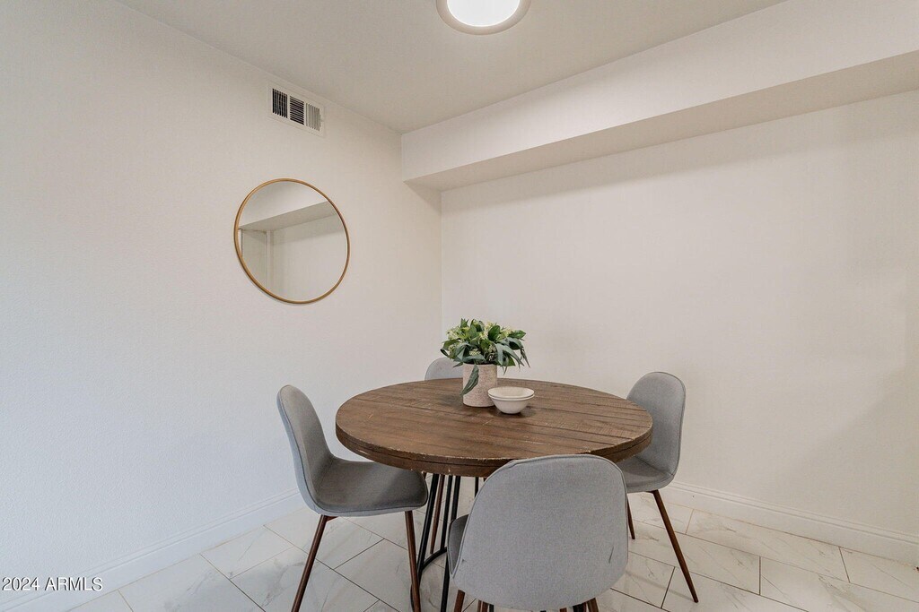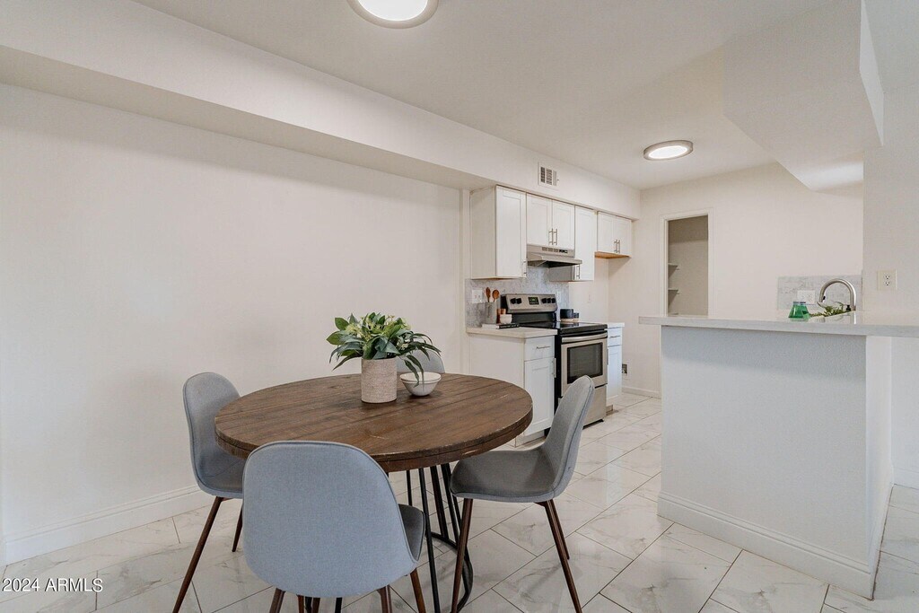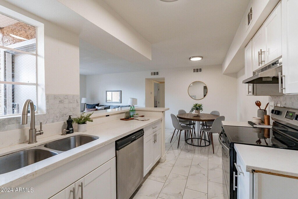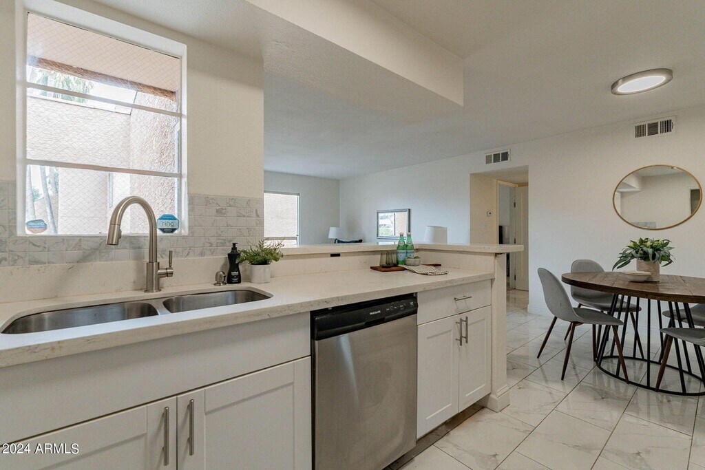 Enjoy resort-style living in this 2-bedroom,2-bathroom condo overlooking the sparkling pool in the heart of the desirable Biltmore/Arcadia area! This gated community offers top-notch amenities,including a pool,spa,and fitness center. Inside,you'll find a living room with cozy carpeting,blinds,chic light fixtures,and a soothing palette. The eat-in kitchen features wood-look tile flooring,wood cabinetry for maximum storage,a striking tile backsplash,and sleek SS appliances. The main bedroom offers a walk-in closet and a private bathroom for added comfort. The open layout and pool views create a comfortable retreat. Unbeatable location,just minutes from premier dining,shopping,and entertainment,with quick access to the SR-51,Loop 202,and Sky Harbor Airport. Don't miss it!
