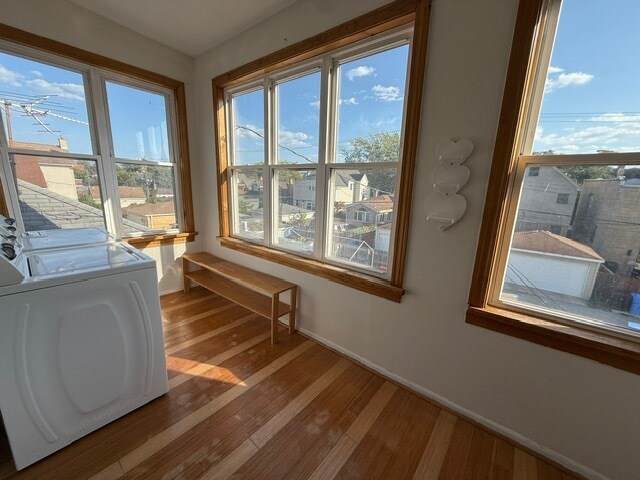 Spacious and well-maintained second-floor residence in Lincoln Square. This 2 bedroom, 1 bath home features hardwood floors & plantation shades throughout, a large living room, formal dining room, eat-in kitchen, and a bright sunroom. Both bedrooms include custom oak built-in closets. Additional highlights include in-unit side-by-side laundry, central air conditioning, and a large shared backyard/patio. There is an exterior parking spot available for rent. The property is located in an owner-occupied building, offering a well-cared-for environment and excellent neighbors. Prime location near Endeavor Swedish Hospital, East River Park with convenient access to neighborhood amenities including restaurants, boutiques, grocery stores, and shopping.