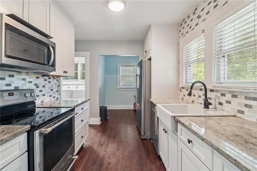 Amazing rental home with gleaming hardwood floors, a screened porch and a huge primary bedroom en suite retreat upstairs. All newly remodeled bathrooms with sweet tile selections, and new kitchen with upgraded stainless appliances and plumbing fixtures. Double lot for plenty of privacy and outdoor space. Plenty of parking in the driveway and wrap around patio for fall grill outs. 4 nice sized bedrooms, 2 full bathrooms, separate laundry room, with washer and dryer included in the rent!