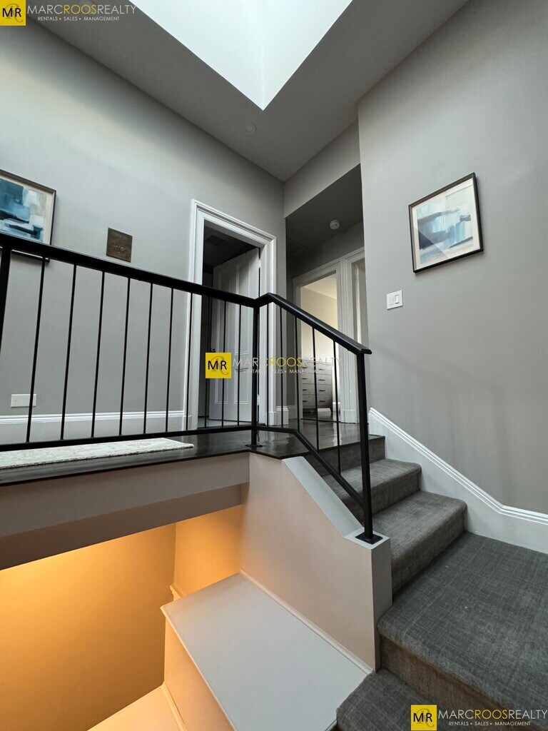 Experience your best life in Back Bay with this floor thru FULLY FURNISHED front facing penthouse that features: - Welcoming entry foyer w/ closet space! - Hardwood flooring shining throughout! - High end, fully equipped kitchen! - Stainless appliances inc dishwasher! - Quartz countertops & breakfast bar! - Open concept floorplan w/ 10 foot ceilings! - Skylights drenching living room in sunlight! - Charming decorative marble fireplace! - 2 generously sized equal bedrooms! - Large closets & ample storage space! - Luxuriously updated marble full bathroom! - Convenient in unit washer & dryer! - Central heating & air conditioning! - Classic wrought iron spiral staircase! - Expansive private roof deck w/ amazing views!