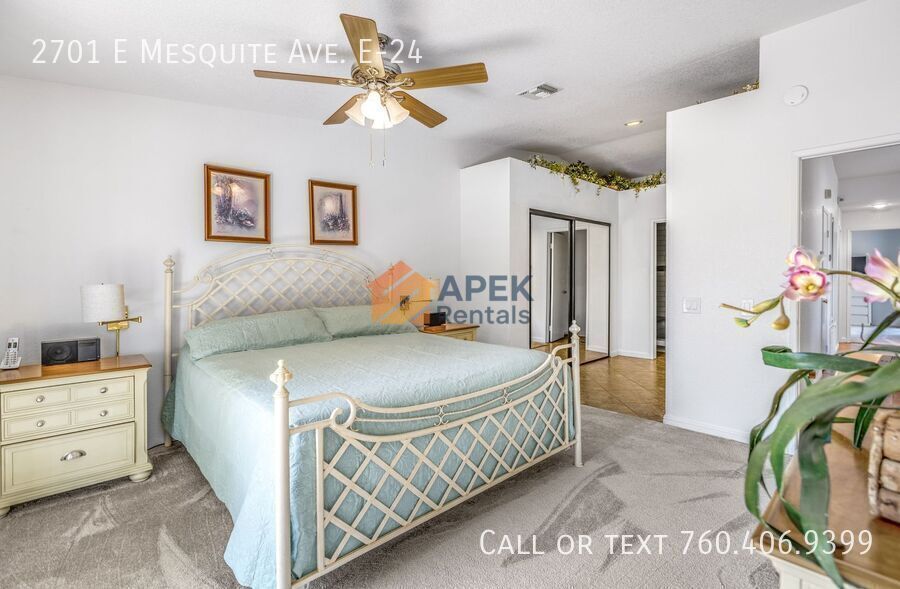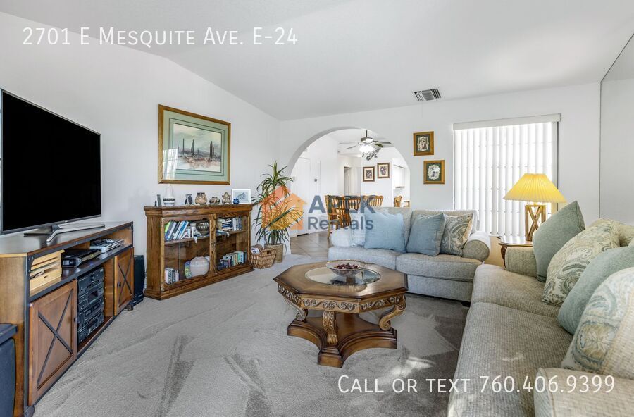 Experience the ultimate in seasonal rental living with a minimum stay of one month. This exquisite 2-bedroom, 2-bath upper-end unit is ideally situated in the heart of the complex, ensuring a peaceful retreat away from traffic noise. The unit comes fully furnished and features elegant tile flooring complemented by select area carpets. Enjoy a restful stay with all the essential amenities at your fingertips. Additional highlights include a flat-screen TV, Wi-Fi, and a fully equipped kitchen complete with a dishwasher and microwave, as well as a Bar-B-Q on the back patio for your outdoor dining pleasure. Nestled in South Palm Springs within Phase IV of Mesquite Country Club, this condo is conveniently located just minutes from downtown Palm Springs, offering easy access to restaurants, shops, and the Casino, all set in an ideal environment for relaxation in our desert paradise. Seasonal rates are as follows: $90/night from June 1 to September 30; $110/night from October 1 to December 15; and $118/night from December 16 to May 31. A security deposit of $800 and a cleaning fee of $175 are required. Please note that pets are not allowed, and credit cards are not accepted. The security deposit is due at signing, with the remaining balance payable via cashier's check 30 days prior to arrival. Tenants are responsible for electricity costs exceeding $100 per month. Please be aware that the unit IS AVAILABLE for January and February 2026 and unavailable from May 1, 2026, to April 15, 2026. MLS# 25546619PS