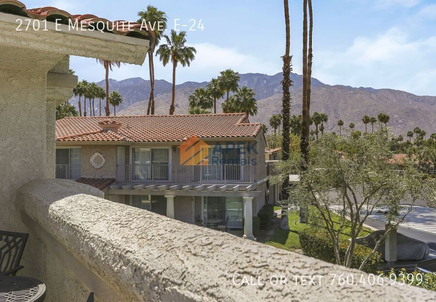 Welcome to your fully remodeled 2BR/2Bath oasis at Mesquite country club! This light,bright,upper level,move-in,ready gem offers spectacular mountain view,located in a serene,amenity-rich community. Exquisitely furnished and armoring fine arts immerse yourself in what Palm Springs lifestyle is all about. Enjoy the tranquility of a quiet neighborhood,paired with 2 tennis courts,7 heated pools and 7 spas and more. Your ideal rental awaits. 10 minutes to downtown Palm Springs. Fully equipped kitchen,newer washer/dryer in laundry closet and appliances,smart TVs in the Master bedroom and living room,indoor and outdoor dining,higher ceilings,high speed internet and cable.