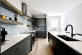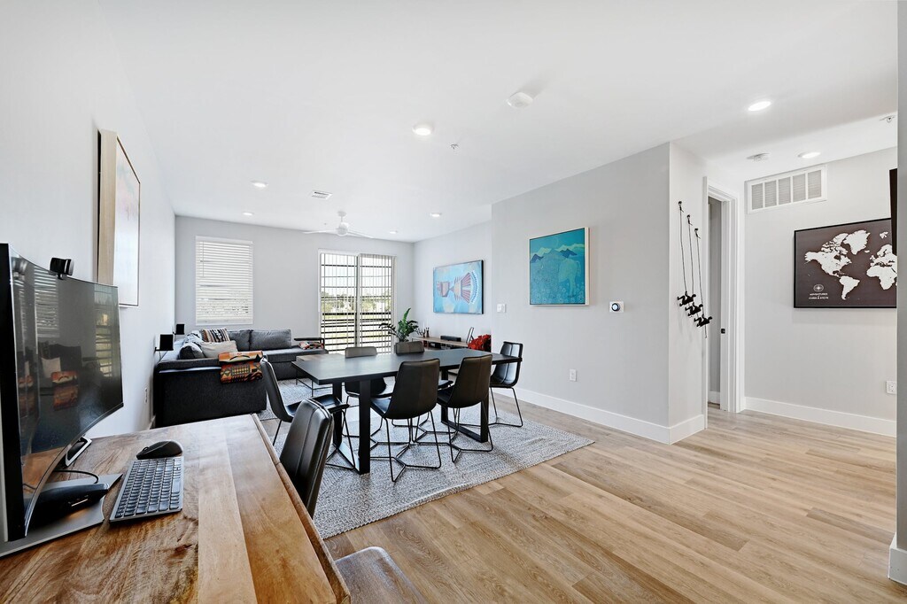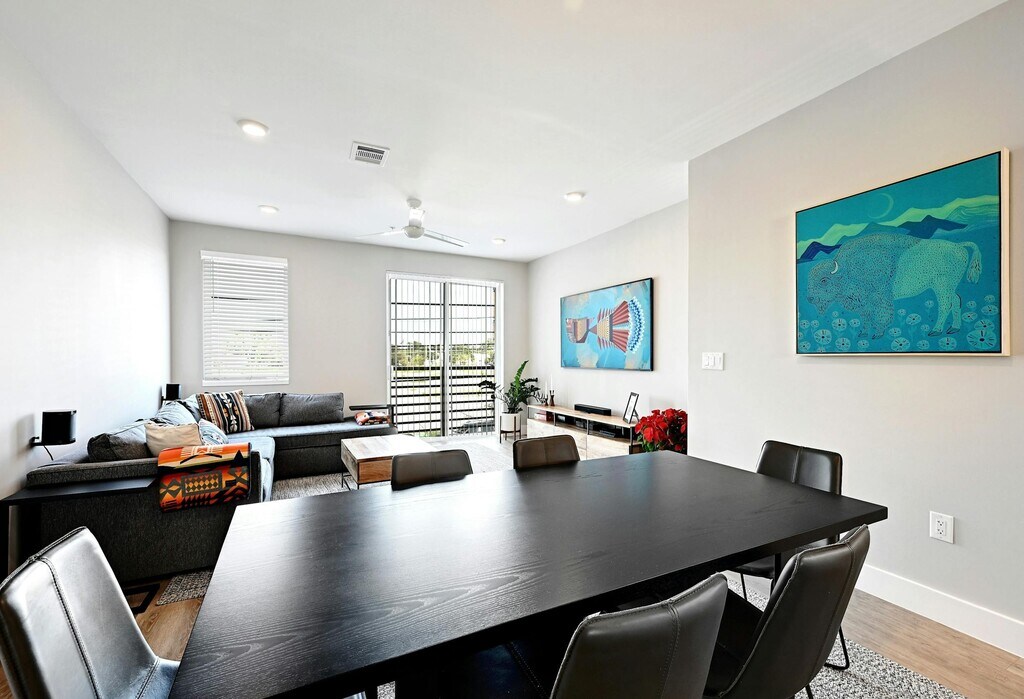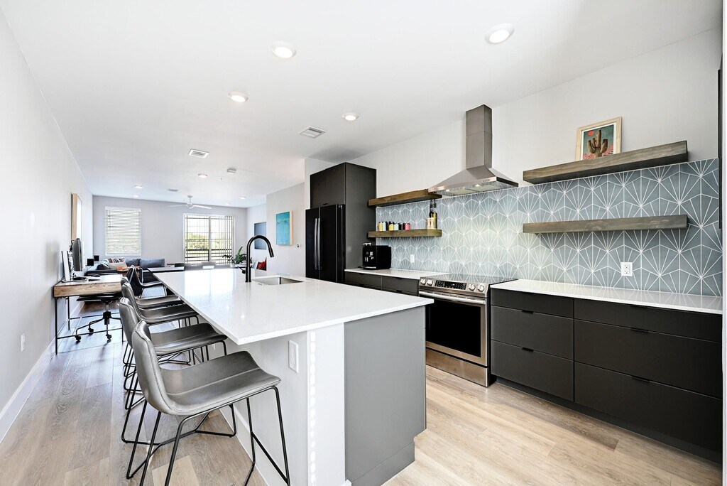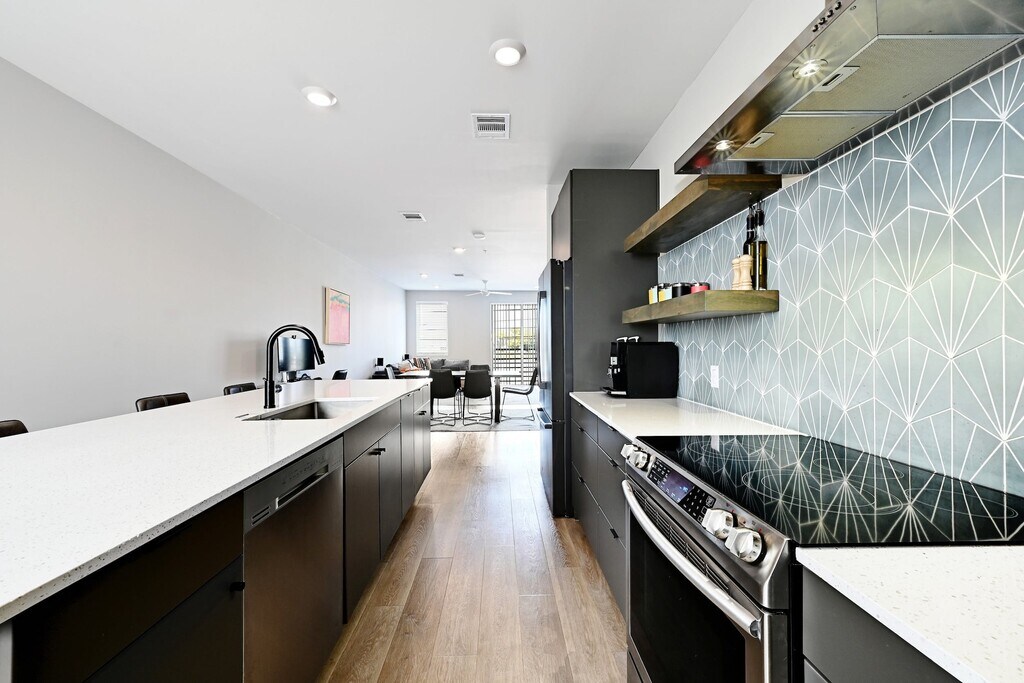 Discover modern living in the heart of vibrant East Austin! This end-unit condo offers the perfect blend of convenience and contemporary design. Located just minutes from downtown, you'll have an array of top-rated restaurants, unique bars, and cozy coffee shops right at your doorstep. Step inside to find 9’ ceilings and sleek hard flooring throughout, creating an open and airy ambiance. The kitchen features quartz countertops, stainless steel appliances, and a center island with a breakfast bar—ideal for casual dining. The living space extends to a charming Juliet balcony. A built-in Murphy bed with a mattress maximizes space and functionality, while the stackable washer and dryer add extra convenience. This unit also comes with one reserved parking space in the gated garage. Take advantage of the community's rooftop terrace and grill area, located just steps from your door—perfect for entertaining or unwinding with stunning city views. For added flexibility, negotiable furnishings include a pullout couch, coffee table, barstools, and a shoe rack.