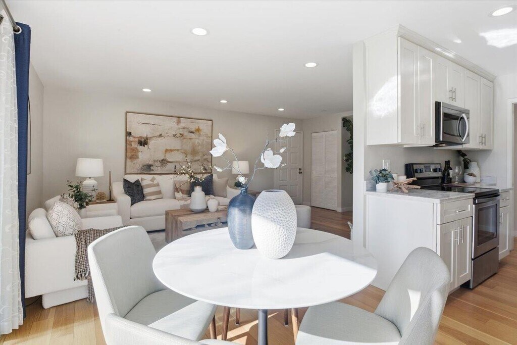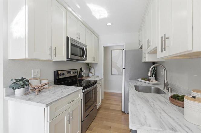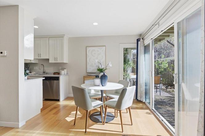 Remodeled unfurnished ground level condo in desirable Mountain View location. New paint from January 2026. New carpet in both bedrooms installed in January 2026 New light fixtures in both bedrooms installed in January 2026 INCLUDES - Gas(heater), garbage disposal and water included in the rental amount. Renter pays for electricity & internet. Smart Home - Smart switches to control recessed lights in kitchen, master bedroom & living room. Can be controlled via voice/Home/Alexa. Updated Kitchen Features - Marble counters, ample white shaker style cabinets, stainless steel appliances. Included Appliances - Refrigerator, dishwasher, induction stove, microwave, oven and 2 in-wall heaters. Stackable Washer/ Dryer in-unit laundry. Modern built-in Ikea cabinets in both bedrooms. Updated patio with pebble landscaping. Assigned one covered carport space. Ample parking for second and guest cars. Additional locked storage closet near parking. Community has a swimming pool, jacuzzi, community room (can be booked). Convenient location only blocks to Mountain View downtown. Close to Stevens Creek Trail, Cal Train, Microsoft, Alphabet (shuttle stop at the community gate), LinkedIn.
