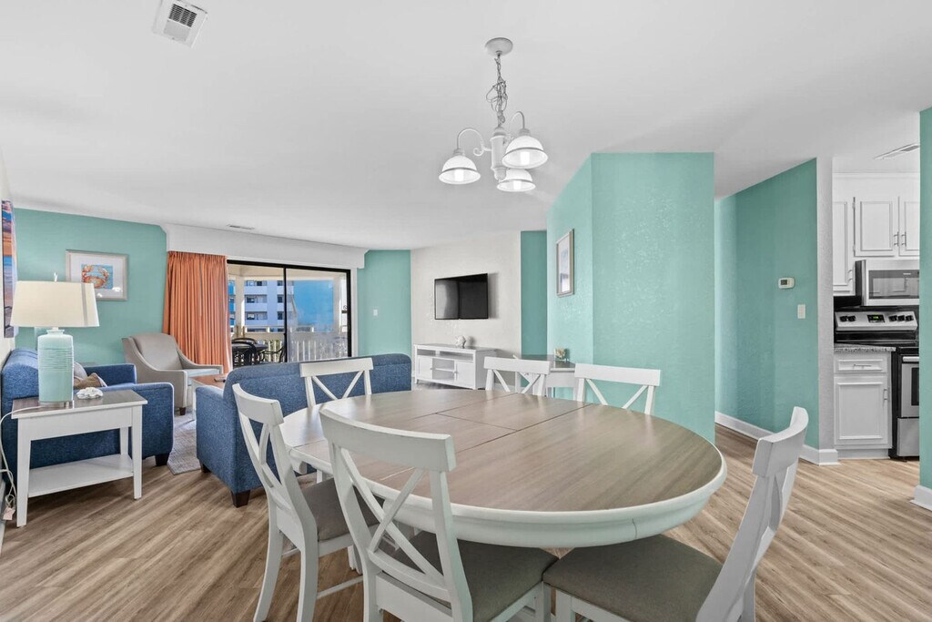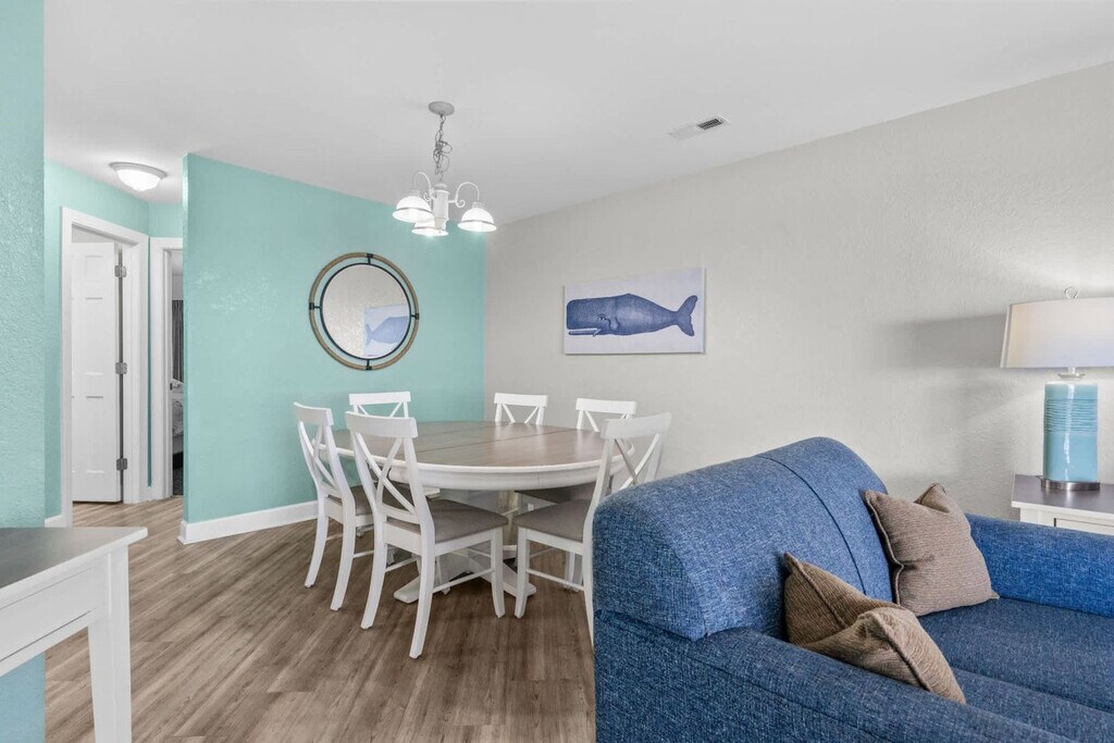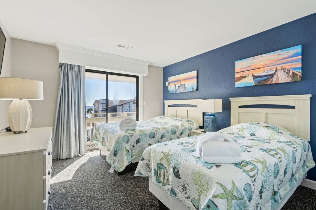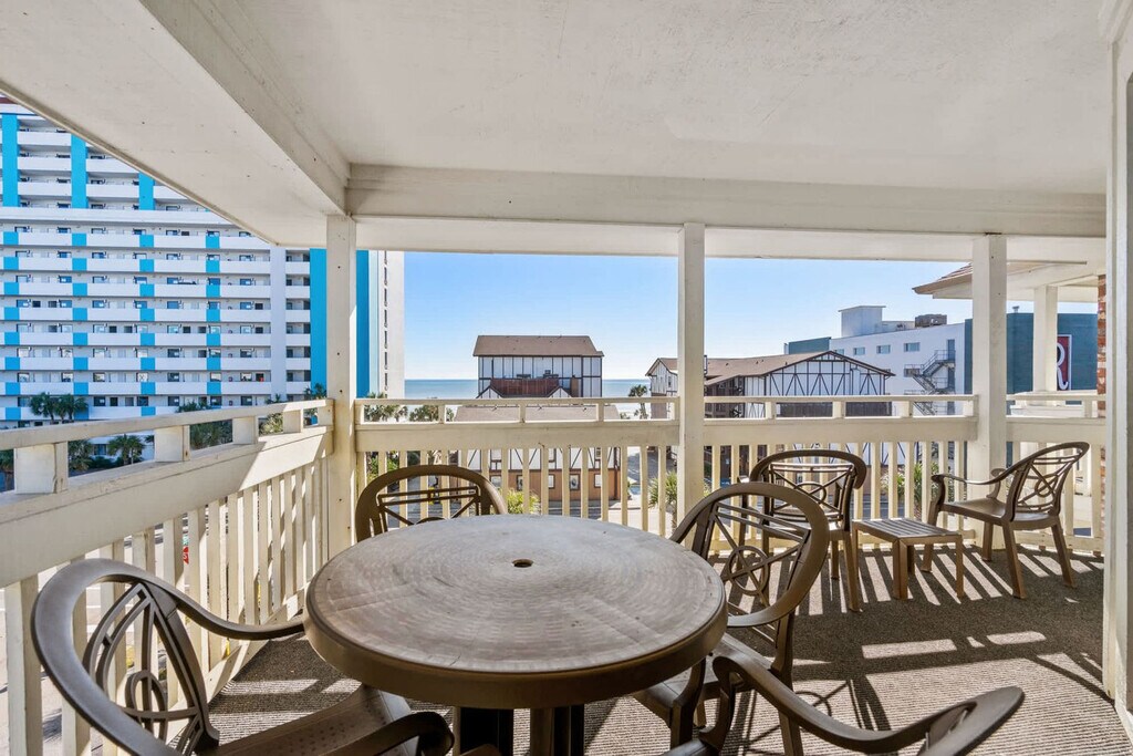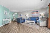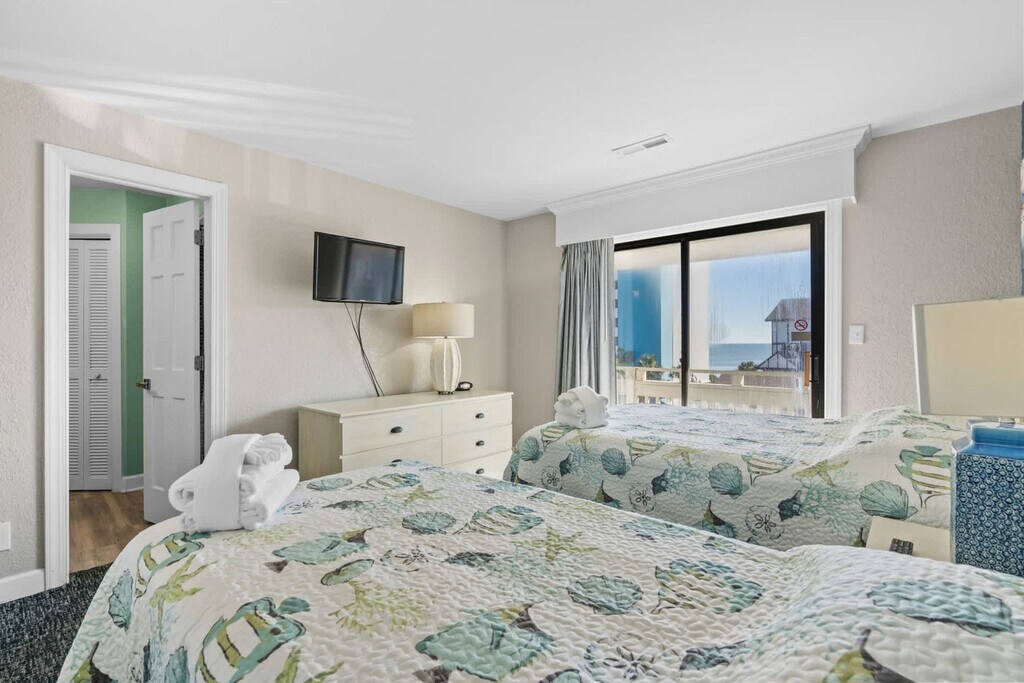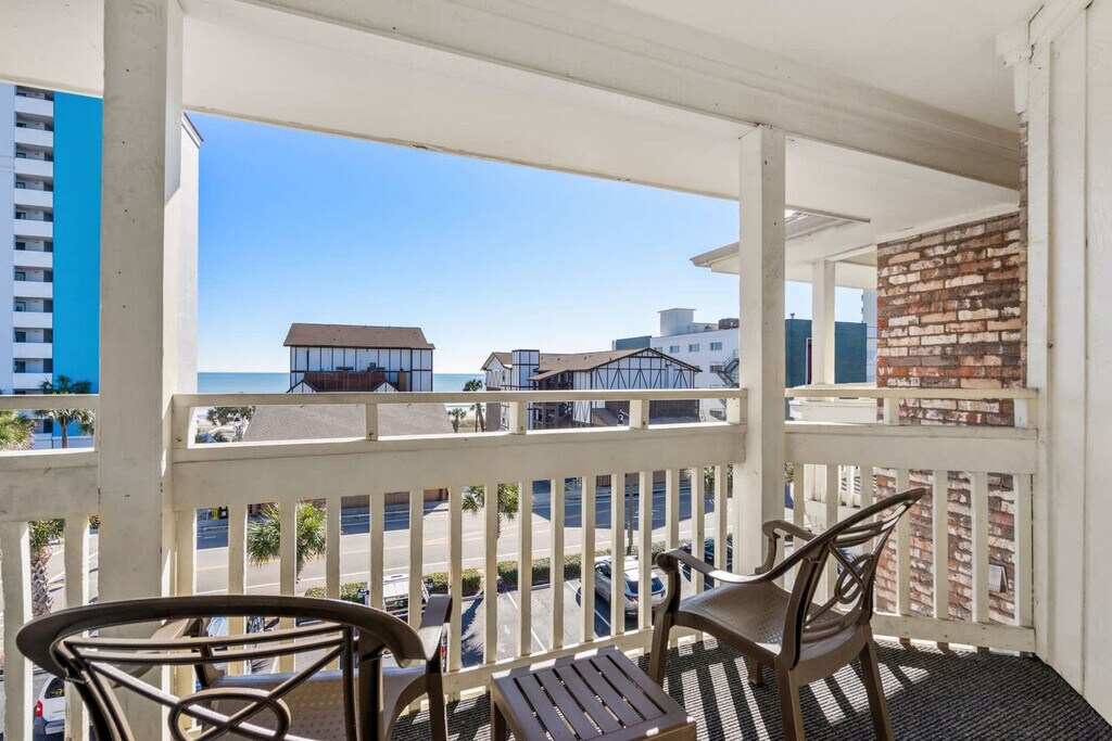 Located in the heart of Myrtle Beach, this condo at 29th Avenue N and Ocean Blvd is directly across the street from public beach access and only a few blocks from Broadway at the Beach, the Myrtle Beach Boardwalk, and the Convention Center. Across the street, you'll find Starbucks and Ben and Jerry's Ice Cream, and one block west is Green's Discount Beverage for all your favorite Happy Hour libations. Walk to the highly rated Sea Captain's House, go 5 minutes to Top Golf, or take a stroll down the Golden Mile to see why it's so named. This spacious and comfortably furnished 2-bedroom, 2-bath condo offers comfort, convenience, and a prime location in the heart of Myrtle Beach. Inside, you'll find an open-concept layout featuring a cozy living area, a dining space with seating for six, and a fully equipped kitchen with everything you need to feel at home. The glass-top dining table and tasteful decor add a stylish touch throughout. The first bedroom features a comfortable double bed and a twin with private access to the balcony overlooking the pool deck. The second bedroom includes two twins, perfect for family or friends. Enjoy your morning coffee or evening breeze on the large wraparound balcony in the front, or unwind on the private balcony off the bedrooms, just steps from the pool. We provide linens for all beds as well as bath towels, hand towels, and washcloths for your stay. Additionally, there will be a roll of paper towels in the kitchen, 2 rolls of toilet paper per bathroom, hand and dish soaps, and 2 laundry pods and 2 dish pods, all included with the cleaning fee. You will want to bring pool and beach towels for your stay, and we recommend renting our super light and durable backpack-style beach chairs to make your stay even more enjoyable, available through a link after your booking. Located directly across the street from the public beach access at 29th Avenue North in Myrtle Beach, you'll be close to all that Myrtle Beach has to offer both on the water and land. There is a Starbucks and Ben and Jerry's across the street, the renowned Sea Captain's House with an oceanfront bar is a 3-block walk away, and you will be less than 1 mile from Broadway at the Beach, the Myrtle Beach Boardwalk, Myrtle Beach Convention Center, and Top Golf. A car is recommended, but you can also walk to several places, making it easy to leave your car in the lot for most of your stay. There is also a bike lane on both sides of the street for cyclists, and Uber is available in the area, though it can be limited at times. The property is non-smoking and pets are not permitted. By state law, occupancy may not exceed 6, including infants and children. Quiet hours are between 11:00 PM and 7:00 AM. Check-in is at 4:00 PM and check-out is at 10:00 AM. [SI]