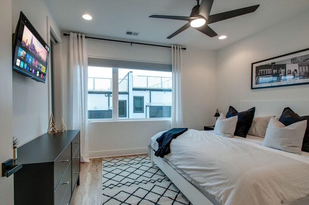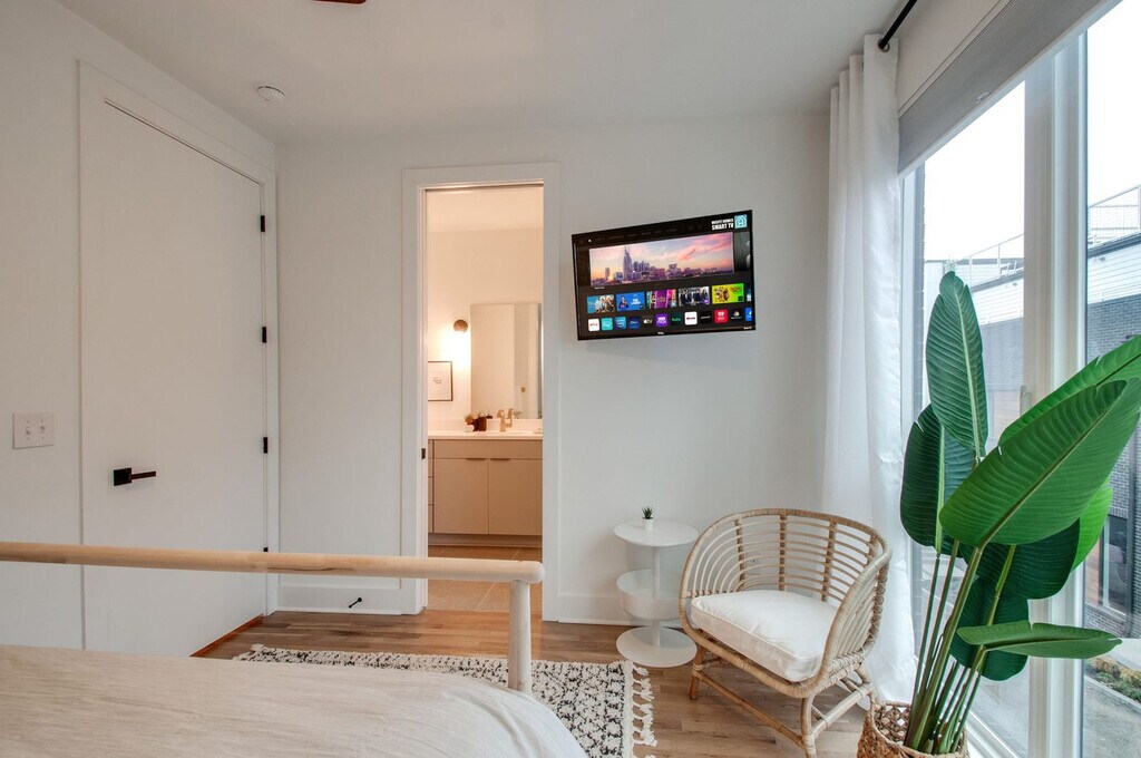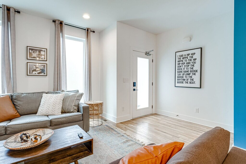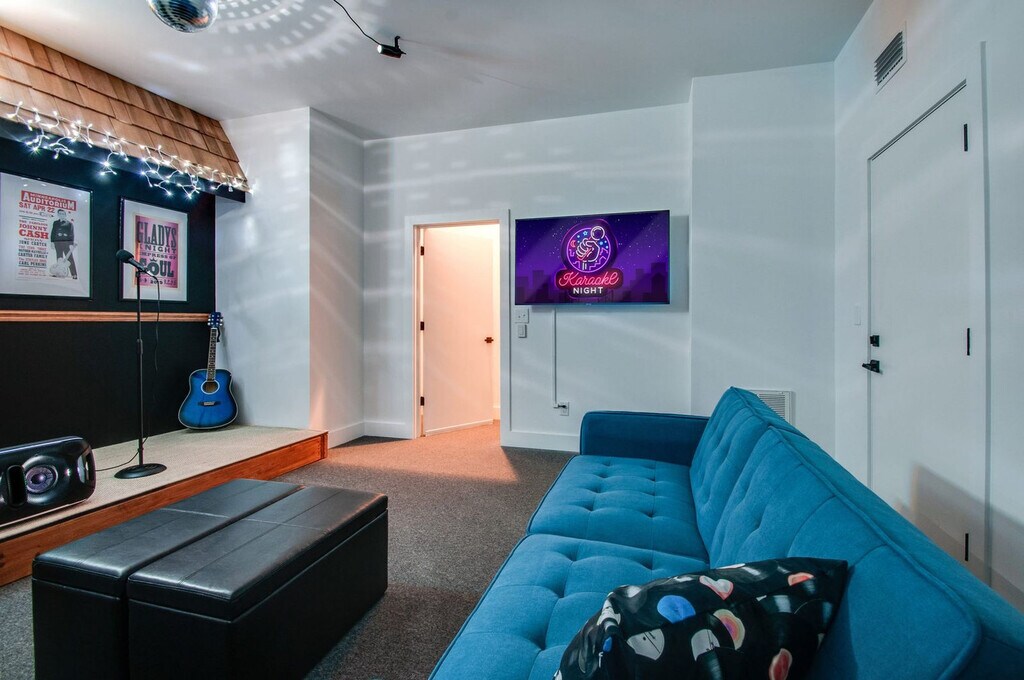 Feel at home in The Blue Bird, your ultimate Nashville retreat. This spacious 4-level home features 4 bedrooms and 4 bathrooms, offering ample space for the entire crew. This entire residence boasts 14 beds, including a king, queens, twins, and convertible couch beds, ensuring everyone has a cozy place to rest. Entertain guests with a top-floor wet bar and a modern, fully stocked kitchen. Smart TVs are placed throughout, including 65” and 55” 4K screens. Enjoy two rooftop decks showcasing skyline views, a private karaoke room, and a game lounge. Includes state-of-the-art appliances, high-speed internet, a large open concept living area, outdoor dining, outdoor lounge space, live TV with all sports channels, TVs in almost every bedroom, towels and linens, an iron and board, a washer/dryer, detergent, and a coffee machine. One-car garage parking is available, but you may need to move game equipment aside. Plenty of free street parking is also available. Situated just 2 miles from downtown Nashville, this apartment places you right by the city’s premier attractions. Discover nearby hotspots such as Hillsboro Village, Music Row, and The Gulch, or indulge in local favorites like the Loveless Café. Experience the vibrant culture, shopping, and dining that define Music City. Getting around is a breeze with a short rideshare ride from anywhere in Nashville. Smoking is not allowed inside the property or near open doors or windows, and a minimum $500 fine applies for violations. Quiet hours are from 10 pm–8 am on weekdays and 12 am–8 am on weekends. If the listing indicates that pets are not allowed, no pets of any kind are permitted. Any undisclosed or unauthorized pet will result in eviction, forfeiture of all rent, and a $150 penalty per pet. If the listing indicates pets are allowed, pets must be disclosed and approved in advance, and a $150 pet fee applies per approved pet. Registration Number: [SI]