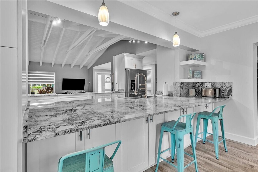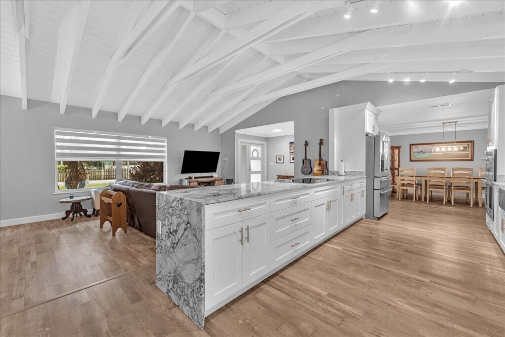 Tropical Oasis in DAVIE on a builder's ACRE! This updated 5/3 home has IMPACT WINDOWS, vaulted ceilings exposed wood beam ceilings, brand NEW KITCHEN with waterfall marble countertops, SS appliances, with so much cabinet storage. If you like to cook, and entertain, this is the kitchen for you. The open layout flows to a stunning travertine patio and sparkling POOL that overlooks a PRIVATE POND stocked with fish and turtles. It's like being on vacation every day. EV CHARGER already in place. Enjoy a spa like primary suite, cabana bath and space for you BOAT or RV. NO HOA to apply for. EASY QUICK APPLICATION PROCESS. Just minutes from top-rated schools, parks, and highways.