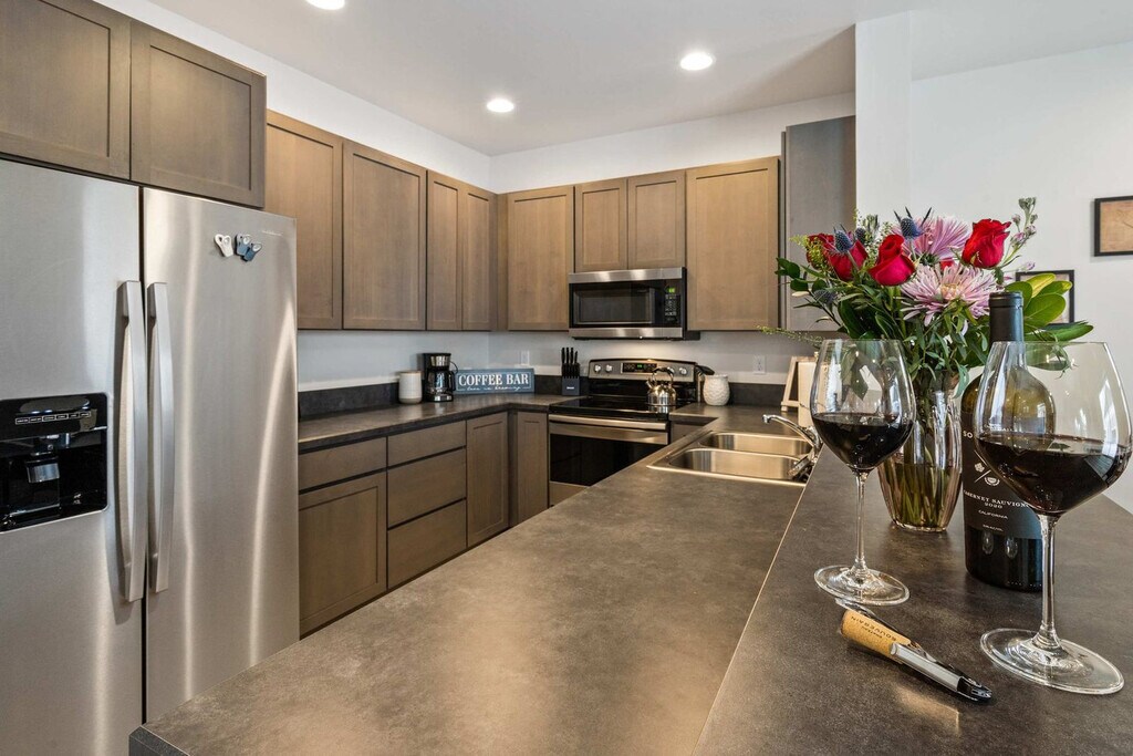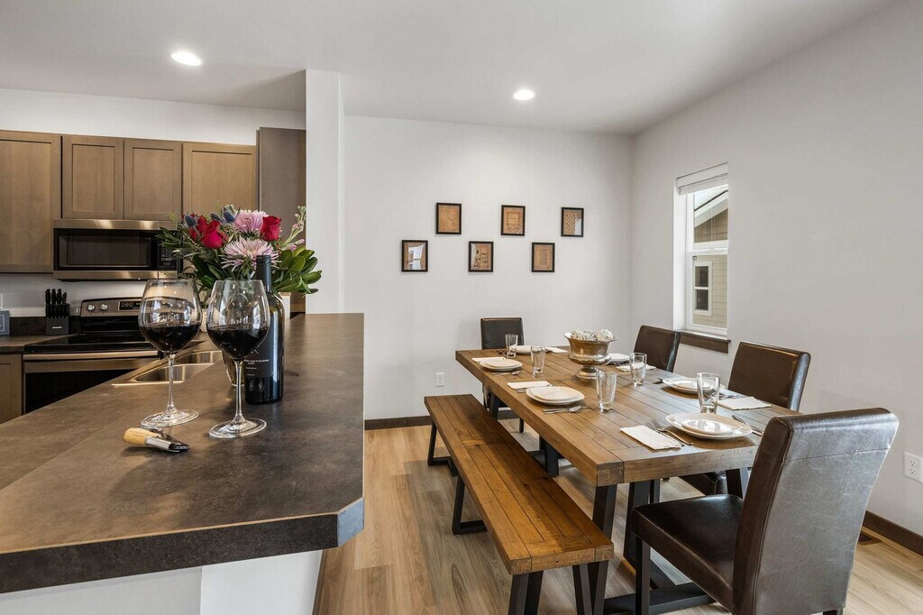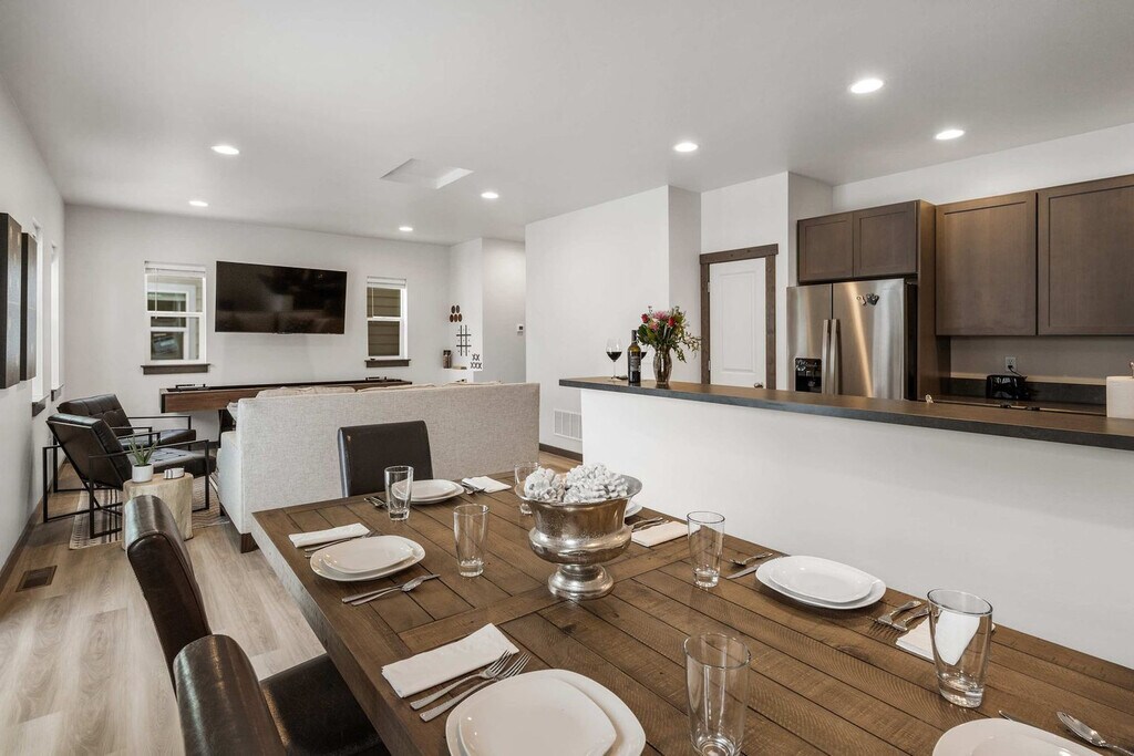 Feel at home in the Jukebox Jet Away, a lavish 3-bedroom, 3-bathroom townhome nestled just a few blocks from downtown Bozeman. This impeccable townhome offers 3,000 square feet of living space and can comfortably accommodate up to eight guests. This home features a fully stocked kitchen, making meal times a breeze with a top-notch set of non-stick pots and pans and complementary cooking essentials. The light-filled dining room is open to the kitchen and features a table that can seat eight. The living room, adjacent to the dining area and kitchen, includes a luxury sofa, a 65” TV, and a jukebox with Bluetooth capabilities. Enjoy the outdoors on the back deck, which is located off the living room and has a gas grill. Entertainment options include foosball and air hockey. A rental car is available. Located just east of Main Street, this apartment is conveniently located near grocery stores and coffee shops. Bozeman’s Gallatin Field Airport is just a 10-mile drive away. Yellowstone National Park is located 80 miles away. During winter months, enjoy proximity to Bridger Bowl Ski Area and Crosscut Cross Country Ski Area, which are a mere 17-mile drive away. Big Sky resort is located just 45 miles away. Vehicles must be parked in the driveway; violators will be towed at the owner's expense. If additional parking is needed, street parking can be found on Michael Grove. Smoking is not allowed on the property. Registration Number: STR23-00057 [SI]