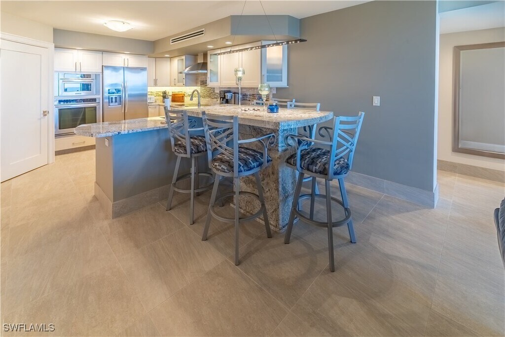 Fantastic sunset views with an unbeatable location. If you've been waiting for a place with great Gulf views and yearlong sunsets,wait no longer. This beautifully remolded unit boasts granite counters,custom cabinets,stainless steel appliances,new wood vanities and so much more. King size bed in the master bedroom and the white leather sofa opens to a queen size bed in the living room. One of the world's finest beaches steps away,a great pool,and minutes from the Philharmonic Center for the Arts,Mercato and fantastic shopping at the Waterside Shops and awesome restaurants nearby.