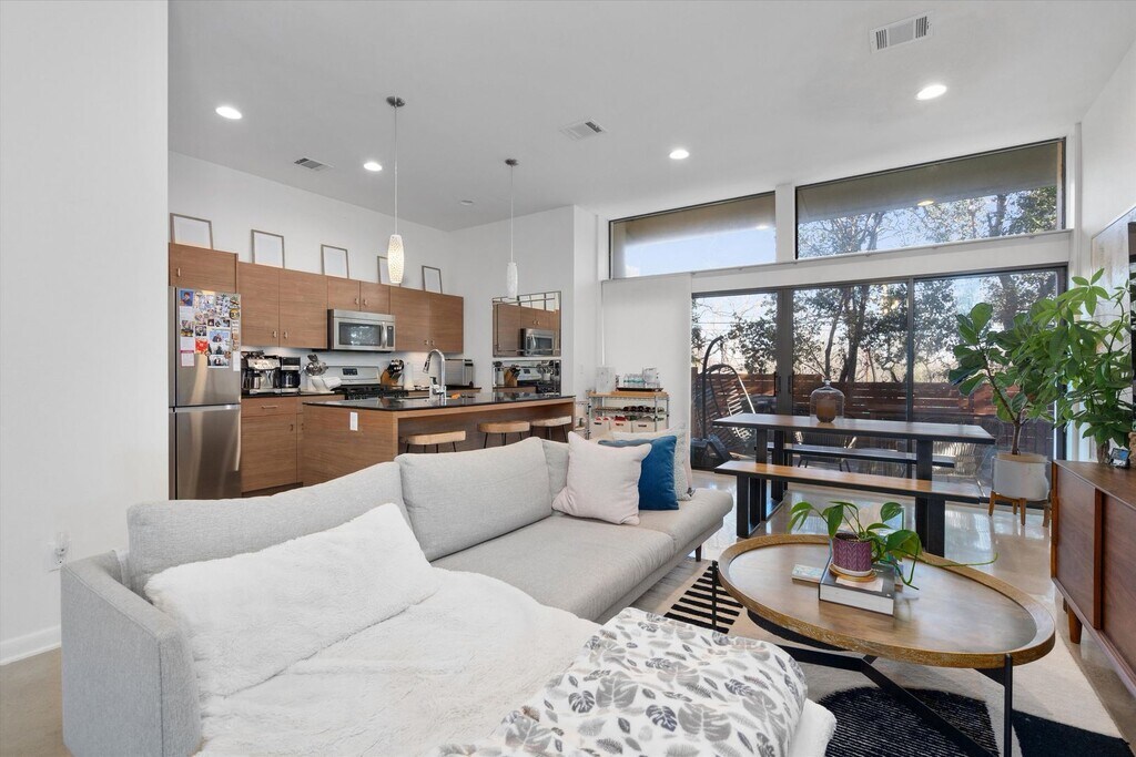Offering the best of Austin's lifestyle, 300 Ashley Dawn is a freestanding home with its own garage situated on a spacious private corner lot in a gated community. Steps away from Cosmic Coffee and Beer, Plaza Colombia, and Crux Climbing Gym. Minutes to S. Congress and S. 1st St. restaurants and shopping. 15 mins to the Airport. The main level living room and kitchen with concrete floors are separated from a serene back yard by beautiful dual sliding glass doors. The tiled patio, luxury composite deck, and artificial turf are perfect, low-maintenance spaces for outdoor entertaining or peaceful dinners. Both of the primary and secondary bedrooms have en-suite full baths. Third-floor treehouse" living area has breathtaking downtown views and abundant natural light. Rich hardwood floors, high ceilings, modern finishes, and large windows throughout the home." MLS ID 9517648