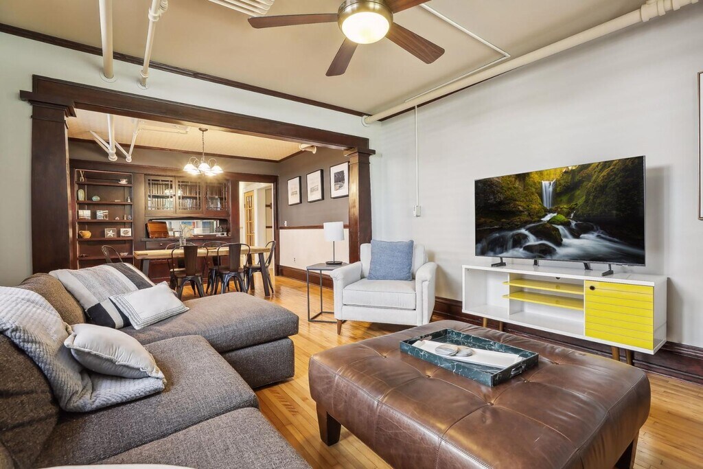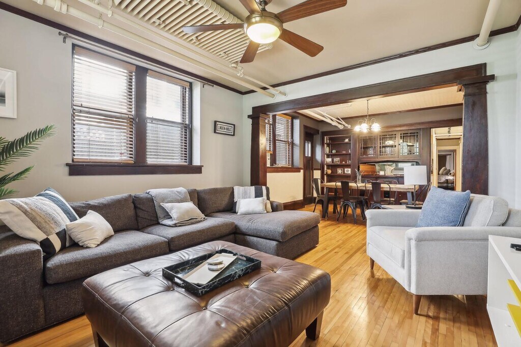 This 2 bedroom, 1 bathroom FULLY FURNISHED condo in this remarkable five unit brownstone building contains exquisite woodwork throughout including stunning hardwood floors, and an immaculate built-in dining hutch. The main bedroom has two closets, a extremely comfortable king side bed, & a desk. The second bedroom features a bunk bed with a twin bed over a full bed. The living room features a Room & Board couch, a separate comfy chair, ceiling fan, and 55 inch TV. It also features an enormous yard and it's just 1 block from all the amazing shops and high-end restaurants in Linden Hills, & just 3 blocks to Lake Harriet! ALL UTILITIES ARE INCLUDED - INCLUDING HIGH-SPEED FIBER INTERNET Plus Live TV, Netflix, & Amazon Prime! Each unit contains furniture, artwork, bedding, towels, etc. as well as wonderful kitchens that are appointed with all the housewares, dishes, pots/pans, a coffee maker, toaster, blender, etc. plus a large refrigerator, oven, microwave, dishwasher, beautiful cab...