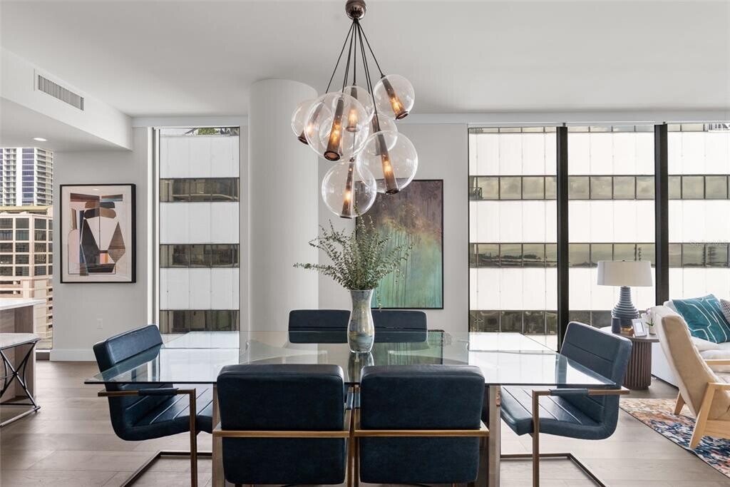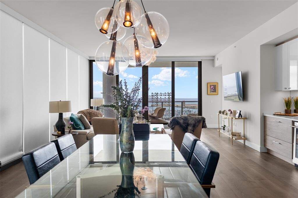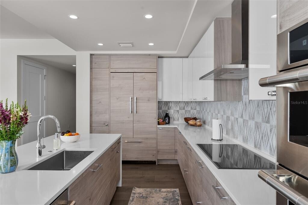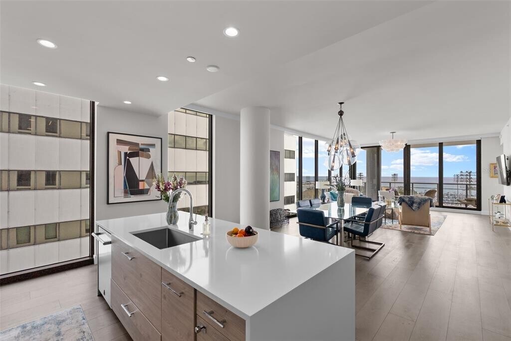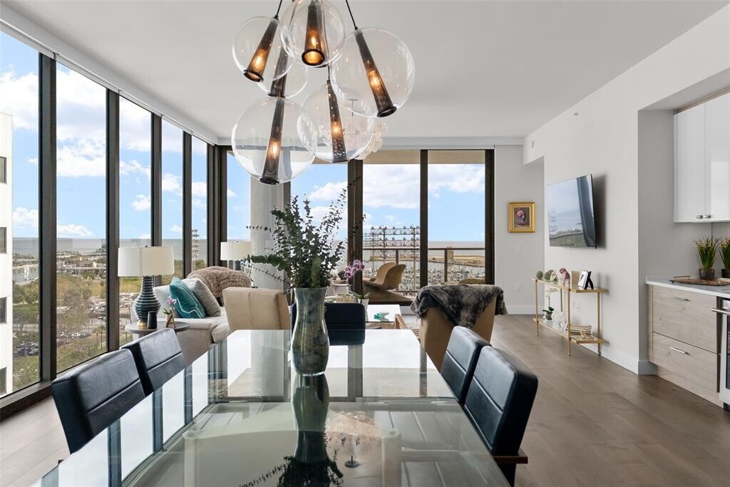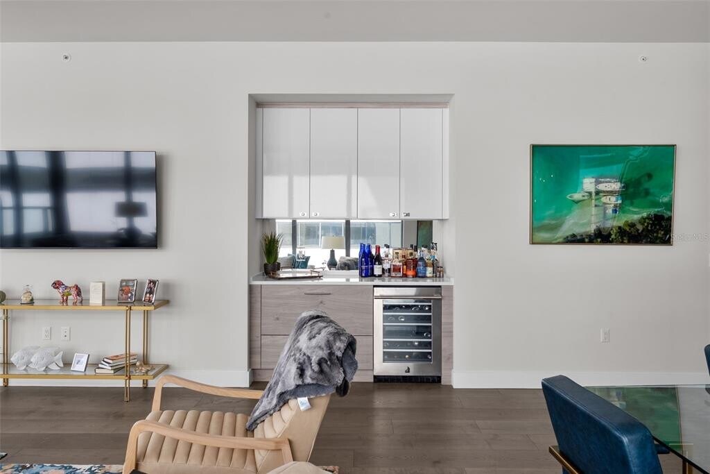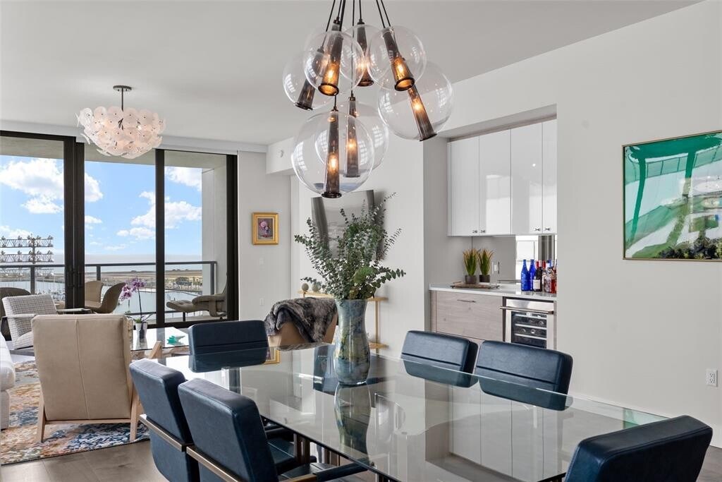 Luxurious residence featuring modern amenities, including tile flooring throughout, high ceilings, and a gourmet kitchen equipped with high-end appliances. It highlights the resort-like amenities available to residents, such as a state-of-the-art fitness center, a pool, and proximity to downtown St. Petersburg's attractions, including theaters and dining options. Living Area: This two-bedroom plus a studio/office that can be converted to 3rd bedroom has tile flooring throughout, two and a half baths open living spaces, ten-foot ceilings with floor to ceiling windows, and professionally designed interior finishes with ample cabinetry in walk-in closets. Remote controlled programable Hunter Douglas shades that can be set to open and close on schedule and other modern features such as a laundry room with front load Whirlpool washer and dryer. High speed Wi-Fi as well as Wired Internet connection in every room for added speed and security for work from home option including business center. The unit comes with two dedicated parking spaces and bike storage. Kitchen: Dream kitchen features imported European cabinetry and quartz countertops with high end fixtures built in Jenn Air refrigerator, Jenn Air oven-microwave, induction cook top with a powerful Anzio Range hood exhaust system. The premium high-end appliances include an under counter 45 bottle Jen Air Wine Cellar with dual temperature control for red and white wine. Resort Like Contemporary Amenities: Contemporary architecture with vibrant urban lifestyle at the heart of downtown St Petersburg with 24/7 security and concierge service. From a state-of-the-art fitness center to a dog walk and park with a dog bath, you’ll find everything you need for a modern, active lifestyle. Five-star amenities rival those of a high-end resort, with pool, Whirlpool spa, fire pit, club rooms, multiple BarBQ stations, an open-air bar. Pool deck and cabanas have an unobstructed view of Tampa Bay. It provides front row seats for the annual Grand Prix. It is steps away from the St. Pete Pier for exciting local events, multiple live stage venues, St Petersburg Yacht Club, City Marina, variety of dining options from gourmet dining to various national cuisines, and neighborhood casual options.