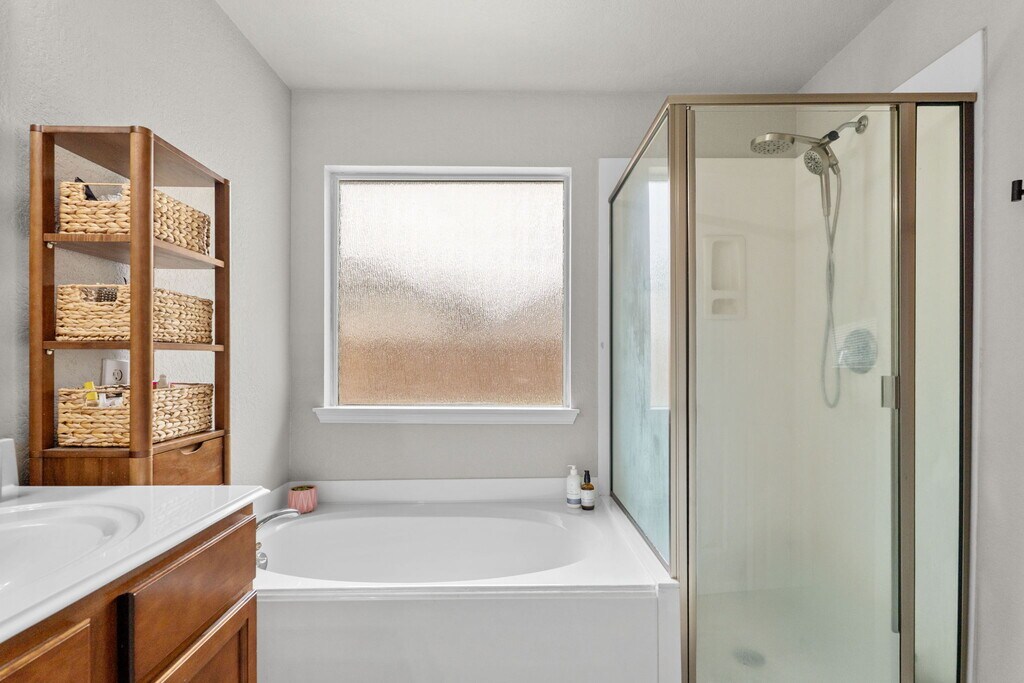 This well-cared-for and delightfully charming 3-bedroom, 2-bath all-brick home is located in the highly convenient Sedona neighborhood near Randolph AFB, making it an excellent rental opportunity. From the inviting foyer, the home opens into a bright, open-concept living, dining, and kitchen area-the true heart of the home. The spacious primary suite is privately situated and features a full bath with double vanities, a separate shower, garden tub, and walk-in closet, while the secondary bedrooms are thoughtfully placed near a full bath for added comfort and convenience. Additional highlights include natural gas heating, a water softener, refrigerator, alarm system, underground sprinkler system, and a large, beautifully landscaped backyard perfect for relaxing or entertaining. Enjoy mature front-yard trees, a generous two-car garage, and walkable access to the amenity center with a resort-style pool, trails, park, basketball court, and pavilion. Convenient to 1604, JBSA Ft. Sam Houston, and surrounding cities, this move-in-ready home offers comfort, space, and an outstanding community lifestyle. This well-cared-for and delightfully charming 3-bedroom, 2-bath all-brick home is located in the highly convenient Sedona neighborhood near Randolph AFB, making it an excellent rental opportunity. From the inviting foyer, the home opens into a bright, open-concept living, dining, and kitchen area-the true heart of the home. The spacious primary suite is privately situated and features a full bath with double vanities, a separate shower, garden tub, and walk-in closet, while the secondary bedrooms are thoughtfully placed near a full bath for added comfort and convenience. Additional highlights include natural gas heating, a water softener, refrigerator, alarm system, underground sprinkler system, and a large, beautifully landscaped backyard perfect for relaxing or entertaining. Enjoy mature front-yard trees, a generous two-car garage, and walkable access to the amenity center with a resort-style pool, trails, park, basketball court, and pavilion. Convenient to 1604, JBSA Ft. Sam Houston, and surrounding cities, this move-in-ready home offers comfort, space, and an outstanding community lifestyle.