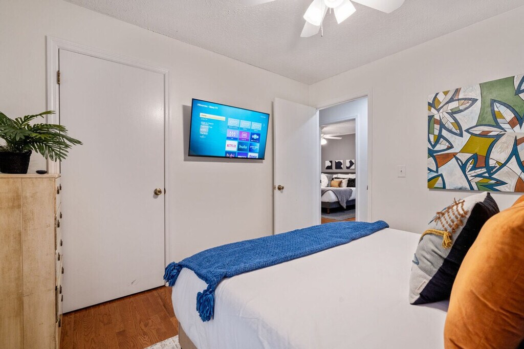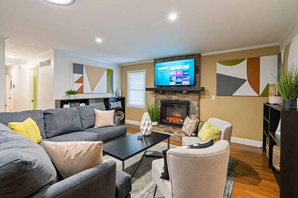Unwind in comfort at this newly updated single-story 3-bedroom, 2-bath home, ideally located just minutes from downtown Woodstock’s best dining, shopping, and entertainment. Whether you're staying for a few nights or a few months, feel at home in this fully move-in ready home. The home features a master suite with a king-size bed, Smart TV, and private bathroom featuring a walk-in shower, as well as two queen bedrooms, each with Smart TVs and fresh linens. Relax in the cozy family room with a Smart TV mounted over the fireplace. The fully equipped kitchen has stainless steel appliances and cooking essentials, and the dining area seats 4 guests. There is also a laundry closet with a washer and dryer, and high-speed Wi-Fi throughout. Pets are welcome with applicable fees. Nearby attractions include Sequoyah Park Disc Golf Course, Ansley Golf Club at Settindown Creek, Atlanta National Golf Club, White Columns Country Club, and The Golf Club at Bradshaw Farm. This is a non-smoking property and no events are allowed. [SI]