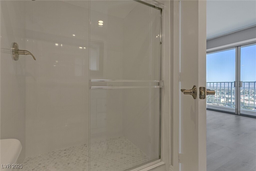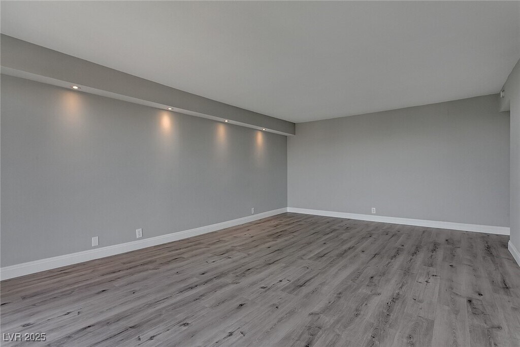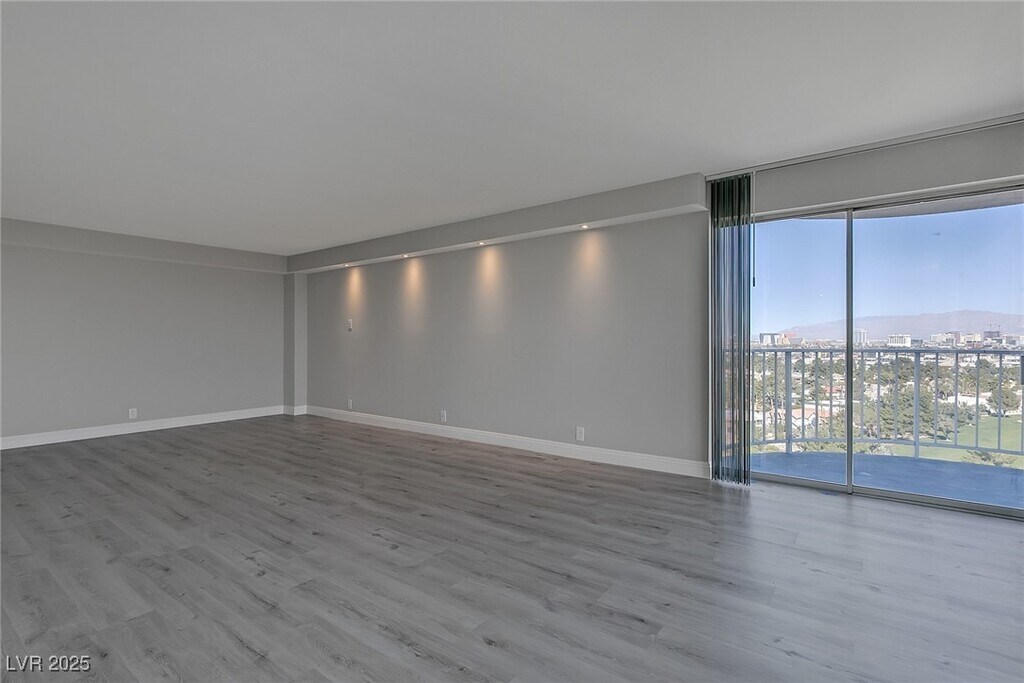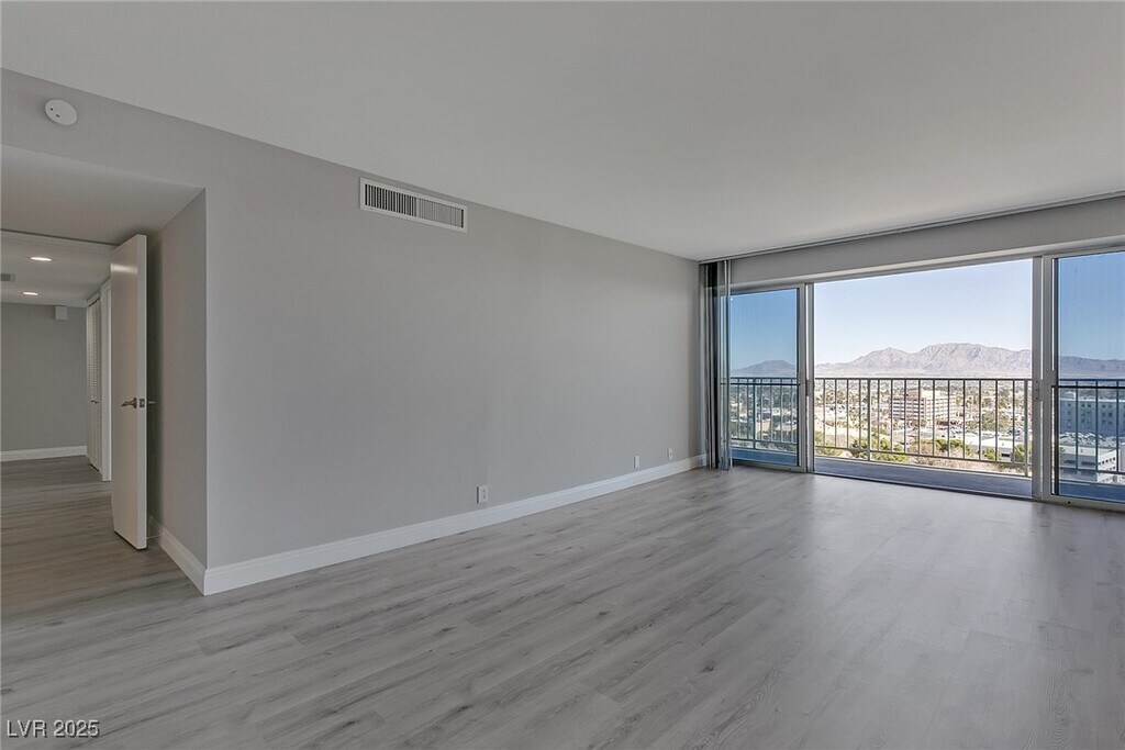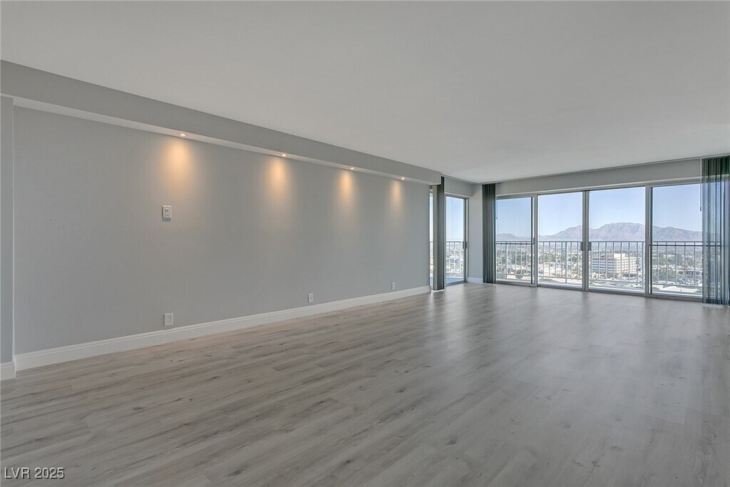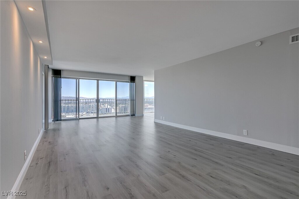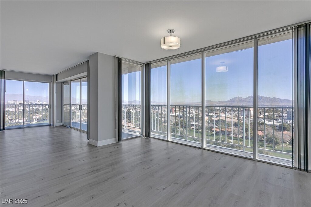 Experience high-rise living on the 11th floor of Regency Towers in the Las Vegas Country Club. This remodeled 3-bedroom residence offers sweeping views of the golf course, Strip, downtown, and surrounding mountains through floor-to-ceiling windows and a spacious wrap-around balcony accessible from every room. The kitchen is equipped with stainless steel appliances, granite countertops, a breakfast bar, and ample cabinetry. The primary suite features a custom walk-in closet and a luxurious bathroom with a tiled standing shower and an additional vanity seating area. The one of the guest bedrooms includes a built-in desk and cabinetry, while the two guest rooms are connected by a Jack and Jill bathroom. Residents enjoy top-tier amenities including 24-hour concierge, valet, security, pool, spa, fitness center, tennis courts, BBQ area, and both underground assigned and guest parking. - Includes cable, WiFi, trash, water, sewage, gym, and pool/sauna access.