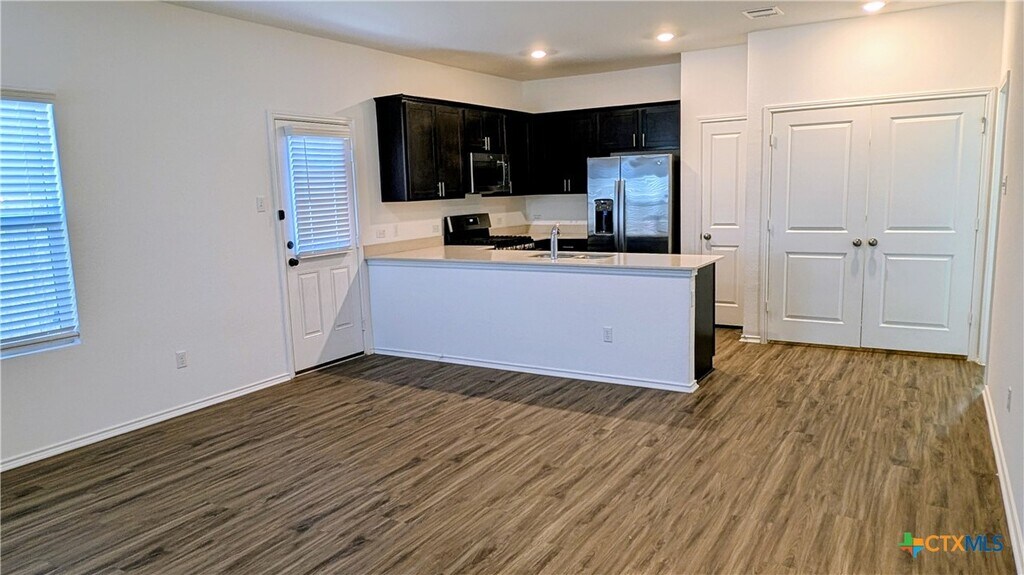 This 3 bedroom, 2 bath home offers comfortable living perfectly situated between San Marcos and Kyle, TX—ideal for anyone needing quick access to both cities. This home features an open-concept layout with spacious living areas, updated flooring, and plenty of natural light throughout. The kitchen boasts dark cabinetry, stainless steel appliances, and a large breakfast bar overlooking the living room. A full-size washer and dryer are included for added convenience as well as a built in water softener. The primary suite offers a generous walk-in closet. Enjoy a private fenced yard, water sprinkler system, landscaping. Owner covers the Wastewater bill for utilities, each month as well. To cool off in the summer each room is equipped with a ceiling fan, and blinds. With easy access to I-35, shopping, dining, and local parks, this home combines convenience with everyday comfort—ready for move-in!