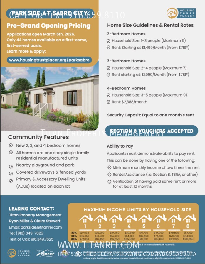 Grand Opening Reduced Rents!! Monthly Rent Range: $1,499.00-$1,699.00 +Monthly Resident Benefits Program: $39.00 To schedule a showing please click the schedule showing button if available now or contact our leasing team at . Please visit to schedule showing or APPLY NOW. Brand New manufactured home in the new affordable housing community, Parkside at Sabre City in West Roseville! These ADU homes are two bedroom, one bathroom unit with one covered carport space. Each home has modern finishes with laminate vinyl plank flooring throughout, nice size kitchen with modern cabinets, solid surface counter, stainless steel appliances and sink, garbage disposal, and full-size stackable washer and dryer. All appliances are electric with stove has an induction cooktop which are energy efficient and very safe to use; they do require use of only cast iron pans. All units have small fenced side yard with bark landscaping for easy upkeep; tenants must maintain private yards and may not change landscaping. One assigned covered carport space directly next to unit and then street parking for any additional vehicles or guests as shared driveways may not be used for parking. Community is built right Sabre City Park maintained by Placer County. Interior 3D Virtual Tour: Pet Policy: Pets negotiable for fully qualified applicants with pet application and management approval, and additional pet addendum required. No more than two small to midsize household pets that are nonaggressive and don't exceed 50 pounds. All pets must be licensed, vaccinated, and profile created and maintained throughout tenancy. Subject to additional terms upon approval. Renter's Insurance Required: All approved applicants will be required to carry Renters Insurance throughout their Tenancy. Utilities paid by Tenant directly: SMUD (Electric) Fidium (Internet) *Homes are prewired with Fidium Fiber Internet and Tenant needs to activate and pay. Fidium modem will include phone jack if landline is preferred as well. Utilities paid by Owner: water, sewer, & garbage. Resident Benefits Program: $39/month This listing is part of an affordable housing program. Household incomes must not exceed the limits published on the website (not to exceed 80% of AMI) based on household size. All household income must be included with this application. Submitting an application does not guarantee a lease and rent rates and AMI limitations will vary by unit. Households must remain income-qualified during tenancy. Income will be verified prior to move-in and re-certified annually at lease renewal. PLEASE READ BEFORE SUBMITTING APPLICATION: Titan Property Management will enforce occupancy standards that establish the minimum and maximum number of household members allowed per home. Household size includes all full-time members listed on the application, including temporarily absent members, children anticipated to live in the home, students away at school, live-in aides, and foster children or adults. Household size must be appropriate for the home and any verified special needs. In general, maximum occupancy is two persons per bedroom, plus one additional person. Titan Property Management will begin accepting applications for homes at this new community. Applications are accepted on a first-come, first-served basis. Any Resident 18 years of age or older who intends to reside at the property or stay more than 3 days per month must apply and pay a $50.00 application fee. The application fee is required from each applicant as a processing fee to verify income, credit, and eviction history. *The $50.00 application fee is non-refundable once the application processing has begun. Applications are processed as received and the first completed application that is fully qualified (meets all the rental criteria listed below) is approved. We accept payment for processing online by credit card at the time you apply. Required Documentation for Application verification process: 1. Proof of Identification: Valid photo ID (Required) & Social Security Card (If available) 2. Proof of Income: Bank connect or upload last two pay stubs and most recent bank statement. 3. Current and Previous Landlord references must be submitted on application for verification purposes. We require current and previous Landlord reference for each Applicant so if Applicants have different Landlords they will each be required to submit. **Addresses provided are matched to credit report and Ownership is pulled through Title to verify accuracy. Landlord phone number and email required. 4. link will be sent after application is submitted to verify your animal(s) or confirmation if no animals. Profile fee only applies to applicants with a pet (waived for emotional support animals, service animals, and applicants with no pets). No pets allowed without written consent of Owner or Agent and if approved additional Pet Rent will apply. As per SB 276, having a housing voucher gives you the ability to use alternative documentation other than a credit report to qualify for this home. Since you have already furnished us with the alternative documentation we will begin processing your application. We will still run a credit report to confirm identity and search for any unlawful detainer actions, bankruptcies or foreclosures but your credit score/history will not factor into our decision to approve you for the home. We will also confirm your rental history with your previous landlords. *Please note any information incorrectly entered on an application requiring re-running the application will require an additional $50.00 application fee and your written authorization so please double check your social, date of birth and previous addresses. Thank you! RENTAL REQUIREMENTS (PLEASE READ CAREFULLY) 1. Completed application with all required documentation for each adult 18 years of age or older 2. Valid Government issued photo ID (i.e. driver’s license or passport) 3. Application fee of $50.00 per adult applicant 4. No 