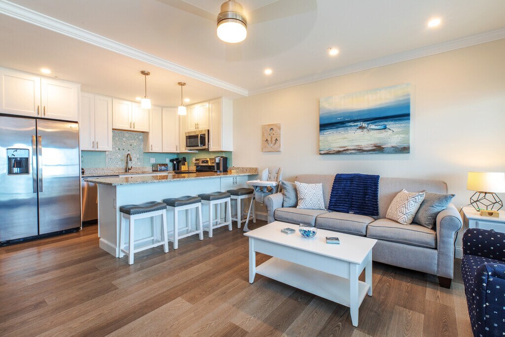 FULLY FURNISHED 6th Floor Penthouse unit directly across from beach available for winter/Spring rental starting January 5, 2025 through May 2026. Spacious two-bedroom two-bath condo with expansive open concept living area overlooking the ocean. Beautiful kitchen with plenty of storage and island seating area, dining area with table seating for 6, very large living room with two seating areas. Covered deck with outdoor furniture and direct waterfront view. Master bedroom suite with king bedroom set and private bath with double vanity and tile shower with glass enclosure, large custom outfitted walk in closet. Additional bedroom with full and twin size bunk bed and custom walk-in closet. Second full bath with tub/tiled shower with glass enclosure. Living room couch pulls out into full size bed. Fully furnished, bedding, towels, kitchen essentials all included. Washer dryer in unit. Elevator access and hard surface flooring throughout. 2 off street parking spaces - one covered, one uncovered in private parking lot. Flat screens TVs in living area and both bedrooms. 1 king bed, 1 full size and twin bunk bed, 1 full size pull out. 6 people max occupancy. No pets no smoking- non negotiable. Tenant pays utilities- electric heat/cooling and wifi/TV service. MLS# 5061815