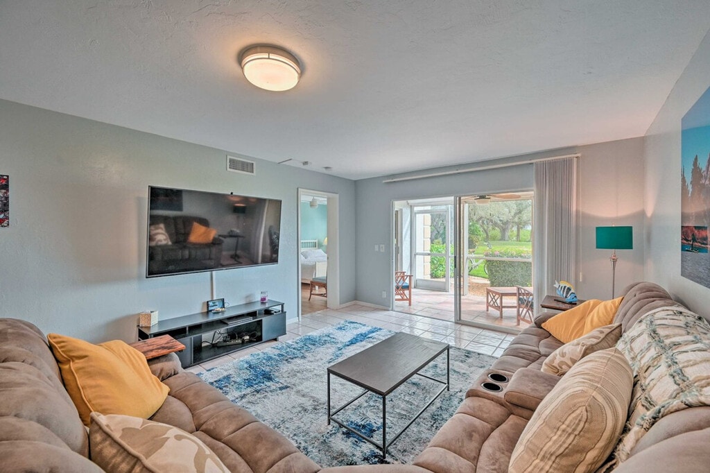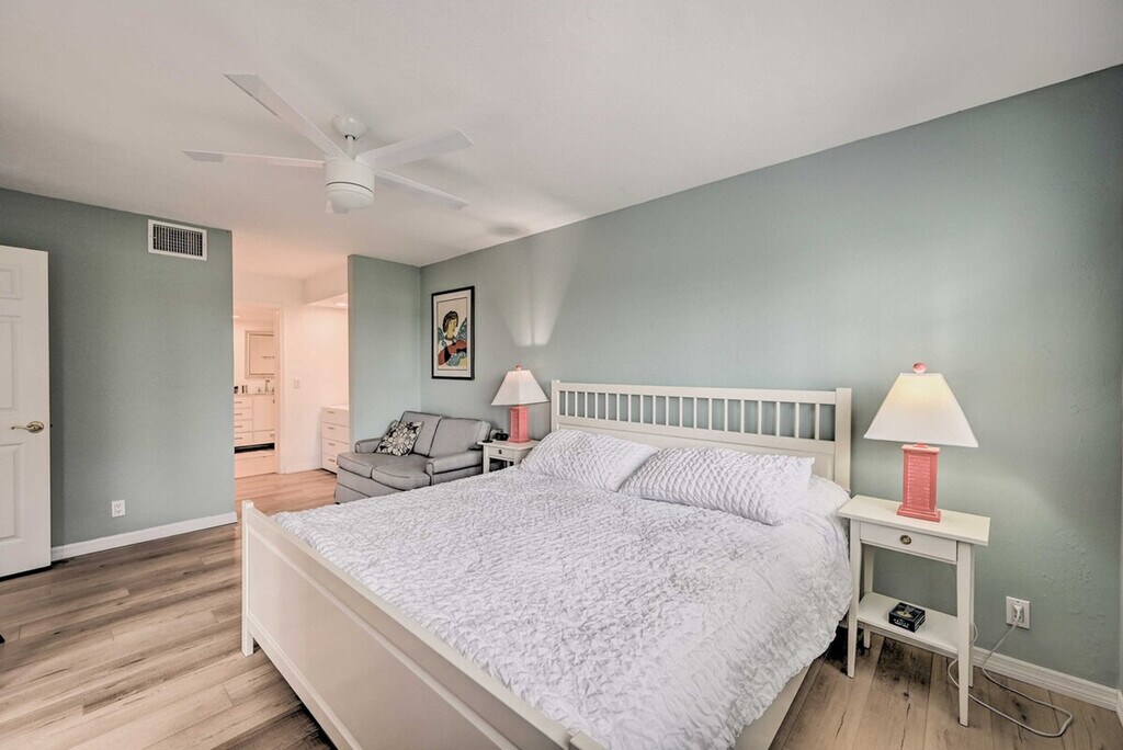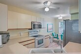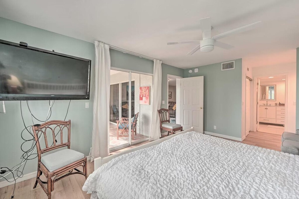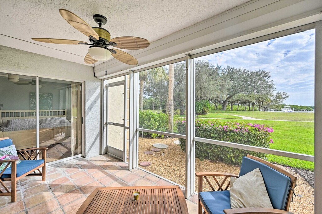 Pack your bags and feel at home in this delightful 2-bedroom, 2-bathroom condo, perfect for a small family or couple seeking sunshine in Florida. Situated on the first floor, this vacation rental offers step-free access and a seamless living experience. With community amenities like two pools and bocce ball courts, relaxation and fun are at your fingertips. Plus, the white sand beaches are just a short walk away, inviting you to enjoy the crashing waves and warm Gulf breezes. This condo features free Wi-Fi and in-unit laundry, ensuring convenience during your stay. The fully equipped kitchen includes a fridge with an ice maker, a drip coffee maker, a glass-top range, an air fryer, dishware and flatware, spices, and a cozy breakfast nook. The open-concept living area boasts smart TVs, a dining table, ceiling fans, and a screened-in patio with outdoor seating, perfect for unwinding after a day in the sun. Parking is available with a carport for one vehicle and a parking lot for passenger vehicles only. Additional fees and taxes may apply. Located just a stone's throw from the pristine white sand beaches, this condo offers easy access to the best of Florida's coastal attractions. Enjoy the nearby community pool, gas grilling area, ponds, and canal views, all contributing to a serene and enjoyable environment. This property maintains a no-smoking and no-pets policy, and prohibits events, parties, or large gatherings. Guests must be at least 25 years old to book, and a photo ID may be required upon check-in. The property requires a minimum stay of 30 nights. For your safety, an Amcrest doorbell device with an exterior security camera is installed, facing the front outdoor entry. The camera records video when motion is detected or when the doorbell button is pressed. A laptop computer is not included. [SI]