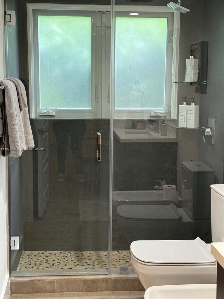 A beautifully renovated two-story villa seamlessly blending modern style with timeless charm. Soaring Cathedral ceilings with exposed wood beams create a warm yet contemporary atmosphere Updated within the past two year, this residence combine classic appeal with modern finishes, brightened by impact-rated windows and doors throughout. The open kitchen that flows into the family room, perfect for daily living and entertaining. Floating contemporary stairs with glass railing lead you to the second floor, where you'll find two spacious bedroom and two full bath. The primary suite features a spa like bath with dual sinks and a sensible walk-in closet. On the first floor, a private one-bedroom suite includes a full bath and closet, ideal for guests or extended family.