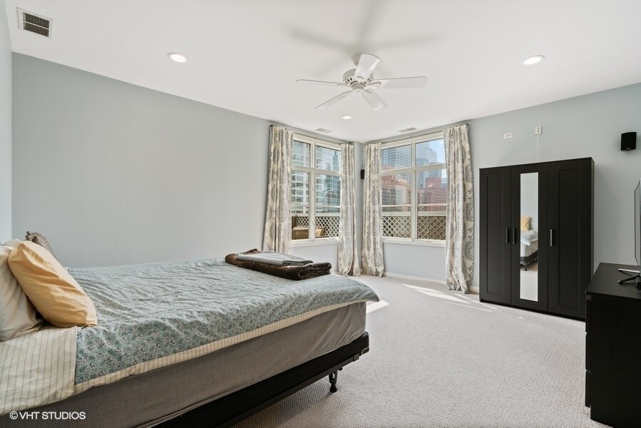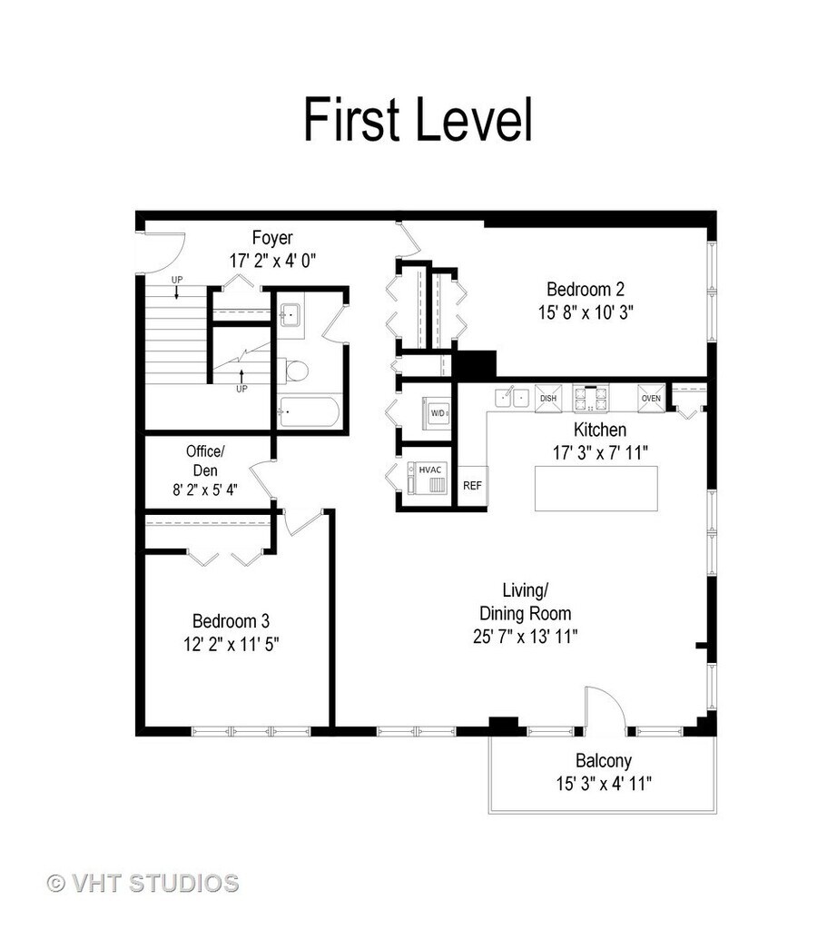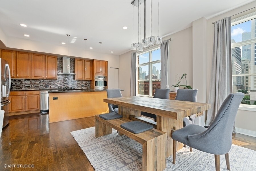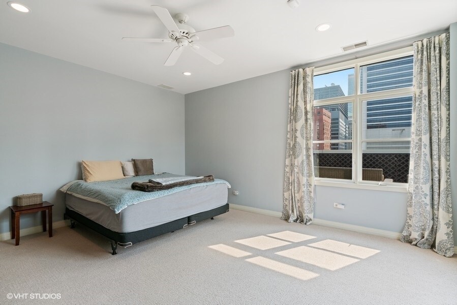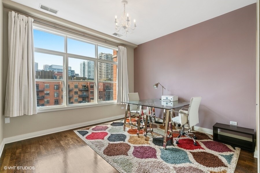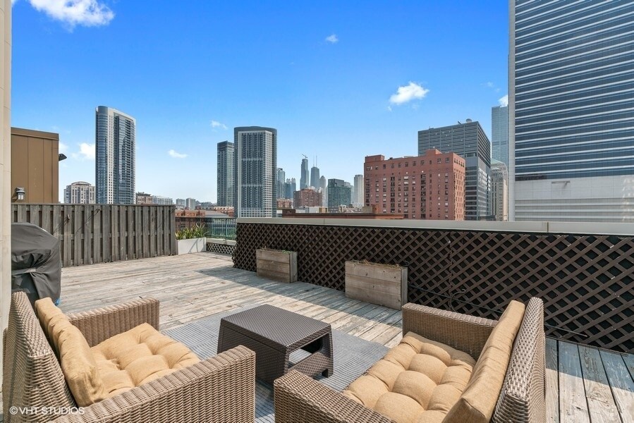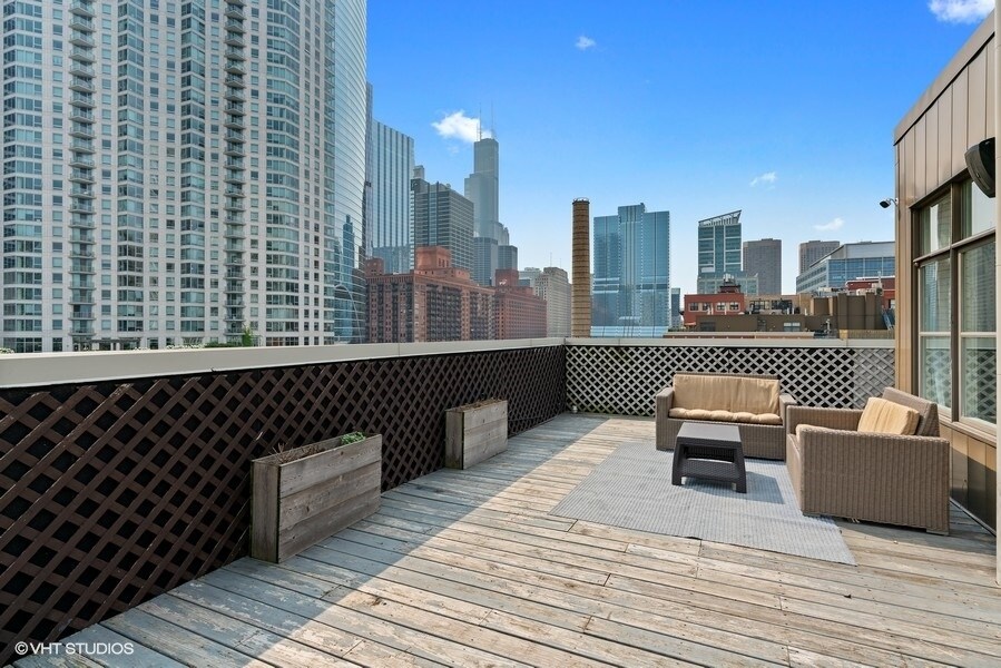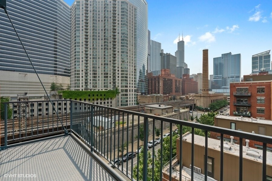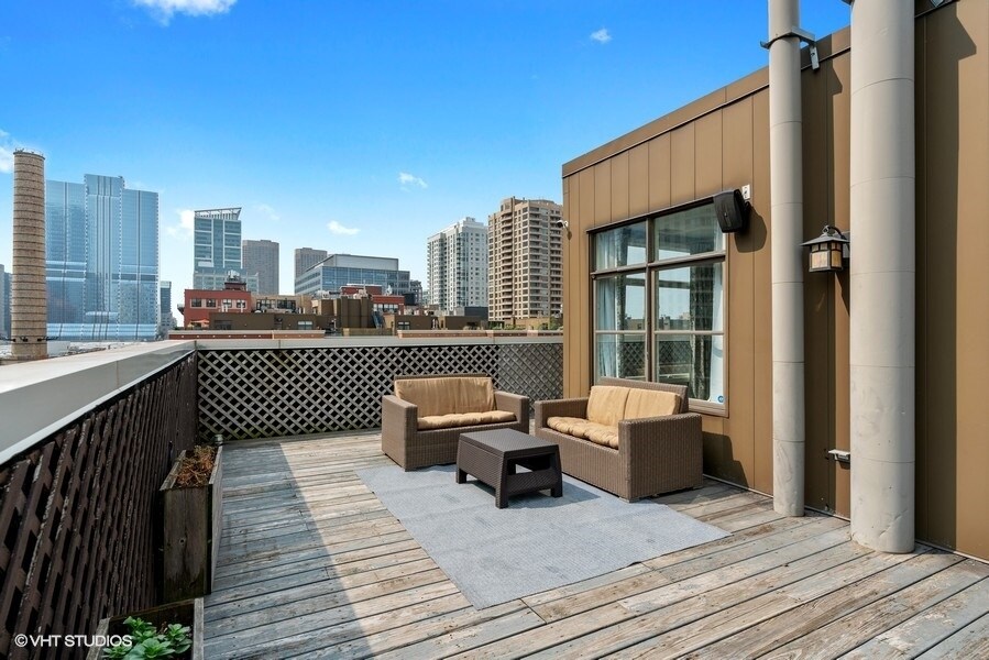 Experience elevated city living in this over 2,000 sq ft 3-bed, 2-bath + office duplex penthouse boasting dramatic southeast corner views of the Chicago skyline. The impressive great room and dining area feature soaring ceilings and rich espresso-stained hardwood floors throughout. The open-concept kitchen is beautifully appointed with granite countertops, a breakfast bar, cherry cabinetry, stainless steel appliances, and a newly installed designer backsplash. The spacious primary suite occupies its own level, complete with a marble bathroom and massive walk-in closet. Two generously sized bedrooms on the main level offer privacy with a split floor plan, plus a dedicated office space for remote work. Enjoy a newly renovated private rooftop deck (updated last summer, not pictured), ideal for entertaining or relaxing with unobstructed city views. Additional features include a new GE washer/dryer, ample storage, and reserved parking. Unbeatable location steps from East Bank Club, the Loop, Green Line, Metra, and some of the city's best dining and nightlife in Fulton Market and West Loop.