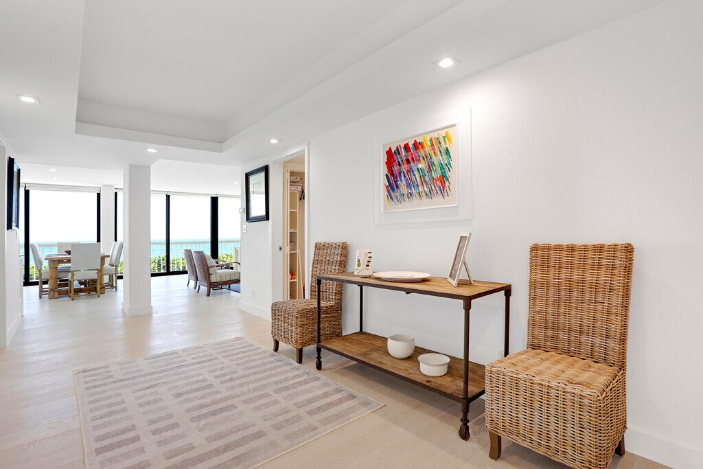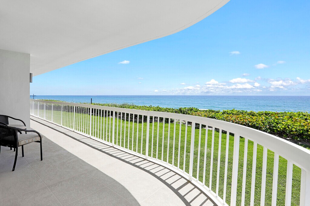 Expansive oceanfront views from this pristinely renovated three bedroom, two and a half bath second floor corner condo unit with full wrap-around balcony! Take in the extraordinarily wide range ocean views from the living room, kitchen, all three bedrooms and the spacious balcony with loungers and outdoor dining table. Be lulled to sleep with the soothing sounds of breaking waves on the shoreline from each room, offering balcony access.Classically designed for comfort and warmth this welcoming, fully furnished turnkey condo unit boasts new wood flooring throughout, a bright and open updated eat-in kitchen with quartz countertops, custom cabinetry, stainless steel appliances and impact windows and sliders throughout. This unit offers a laundry room with washer and dryer. Relax ...