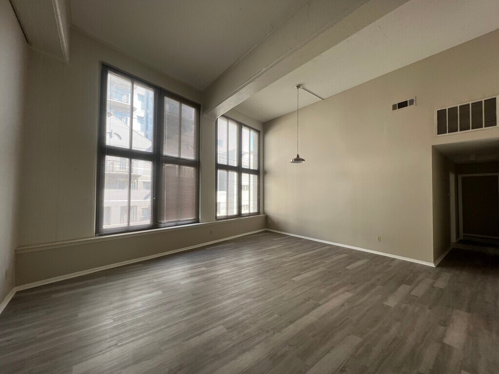 Spacious 2-bedroom, 2-bath condo at 333 Julia, Unit #311 featuring huge windows and high ceilings in the large living area and primary bedroom, overlooking a quiet block of Commerce Street. The second bedroom has a cozy window facing the courtyard. Enjoy a sense of openness while being tucked away from Julia Street. The kitchen is well-equipped with full-size appliances, washer and dryer, and ample cabinet storage. One assigned parking space is conveniently located in the outdoor lot by the exit. Residents also have access to a gym on the 2nd floor and a pool with city views on the 4th floor. A rare blend of light, space, and convenience in a prime location. Never miss out on this opportunity—call us for a viewing today!