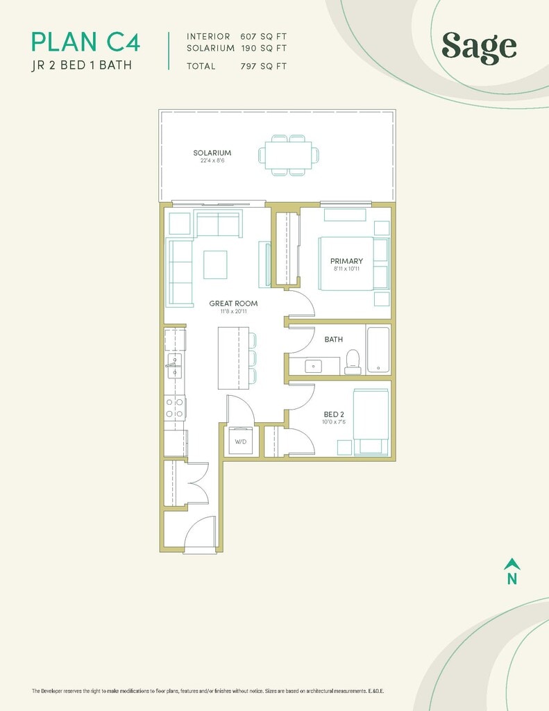 Renting a home at Sage offers a sense of pride. Inside the homes you'll be greeted with the type of quality that never compromises on the essentials—air conditioning, durable quartz countertops, and reliable Samsung appliances are all included to provide the comfort and functionality you're looking for. C1a Starting at $1,750 - $1,825 A light and modern Scandinavian inspired interior theme sets the stage for you to personalize, a canvas that's yours to shape. Every home has a foundation of design excellence, boasting 9' ceilings, durable laminate flooring, and open-concept layouts. • Open Concept living • Includes a 101 Sq ft Lumon retractable solarium enclosure, with a heater for year round living • Light modern Scandinavian design scheme • High performance Air Conditioning • Durable laminate flooring • 9' ceiling • Fresh white lower cabinets with complementary light oak laminate upper cabinets • Large marble vein polished porcelain tile backsplash • Durable quartz countertops • Matte black sink with spray faucet • In Suite Laundry • Reliable Samsung Appliances • Grand Lobby entrance with Key fob entry system for all buildings and parkade for security • Underground Parking and storage lockers • No smoking rentals *Photos may not be of exact unit*