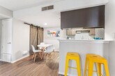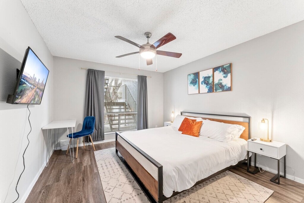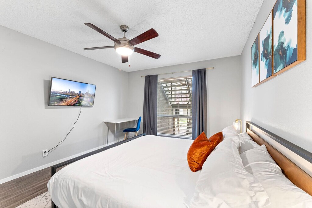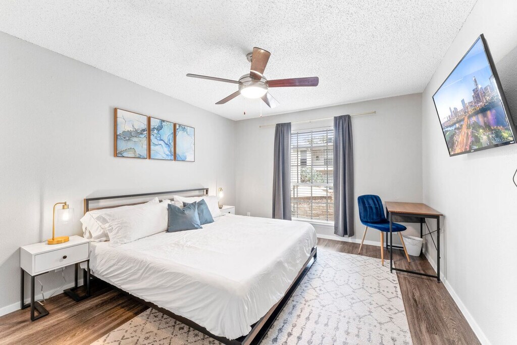 The advertised rate of $2,884/month is the lowest available price, based on a 30 day(s) stay with a move-in date of July 21, 2026. Rates vary depending on the duration of stay, season, and other parameters. For exact pricing and additional pricing components, please visit our website and enter your desired move-in and move-out dates. The rate is applicable when billed upfront; it can be higher if billed in multiple payments. Welcome to your new home in South 1st/SoCo, a true gem of the city with a diverse selection of food, entertainment, and outdoor activities. This 950 sqft 2-bedroom apartment is located on the 1st floor and is accessible via a small flight of stairs. This home-inspired apartment offers a fully stocked kitchen, a large bedroom, an en-suite washer and dryer, and fast Wi-Fi. The fully equipped kitchen includes pots and pans, bakeware, dinnerware, silverware, cookware, blender, and toaster. There is a dedicated dining area with a dining table and chairs for four. Enjoy ultra-soft linens, down comforters, memory gel and gusseted pillows, and a 12” luxury memory foam mattress on the king-size beds. For entertainment, there is a 50” smart TV in the living room with complimentary access to live cable (YouTubeTV), Disney+, Amazon Prime Video, HBO Max, Hulu, and ESPN+. Each bedroom has a 43” smart TV. Complimentary coffee and tea are provided with a Keurig machine and pour-over coffee. This apartment is pet-friendly with a fee of $25 per pet per night for stays of 1 to 4 nights, $200 per pet for stays of 5 to 29 nights, and $300 per pet per month for stays of 30 or more nights. Free on-site surface lot parking is available. South 1st Street is one of the trendiest and liveliest communities in Austin, located right below Downtown Austin and adjacent to SoCo (South Congress). Guests can enjoy a scenic view of Lady Bird Lake and the city beyond while taking a walk along The Boardwalk. The neighborhood is home to many cheap trendy eateries and coffee shops. Downtown is 8 minutes away, Zilker Park (ACL) is 12 minutes away, Barton Creek Greenbelt is 8 minutes away and the airport is 8 minutes away. This community and its buildings were built in the 1990s and therefore might exhibit signs of interior and exterior wear, outdated aesthetics, awkward floor plan layouts, and other quirks and features common in older properties. Quiet hours are between 10 PM and 8 AM. Smoking violations are subject to a $1,000 fine, which includes the cost to clean, deodorize, and repair damages. Undisclosed pets will be charged at $200 per day. Each bedroom has a dedicated workspace with desks and chairs. [SI]