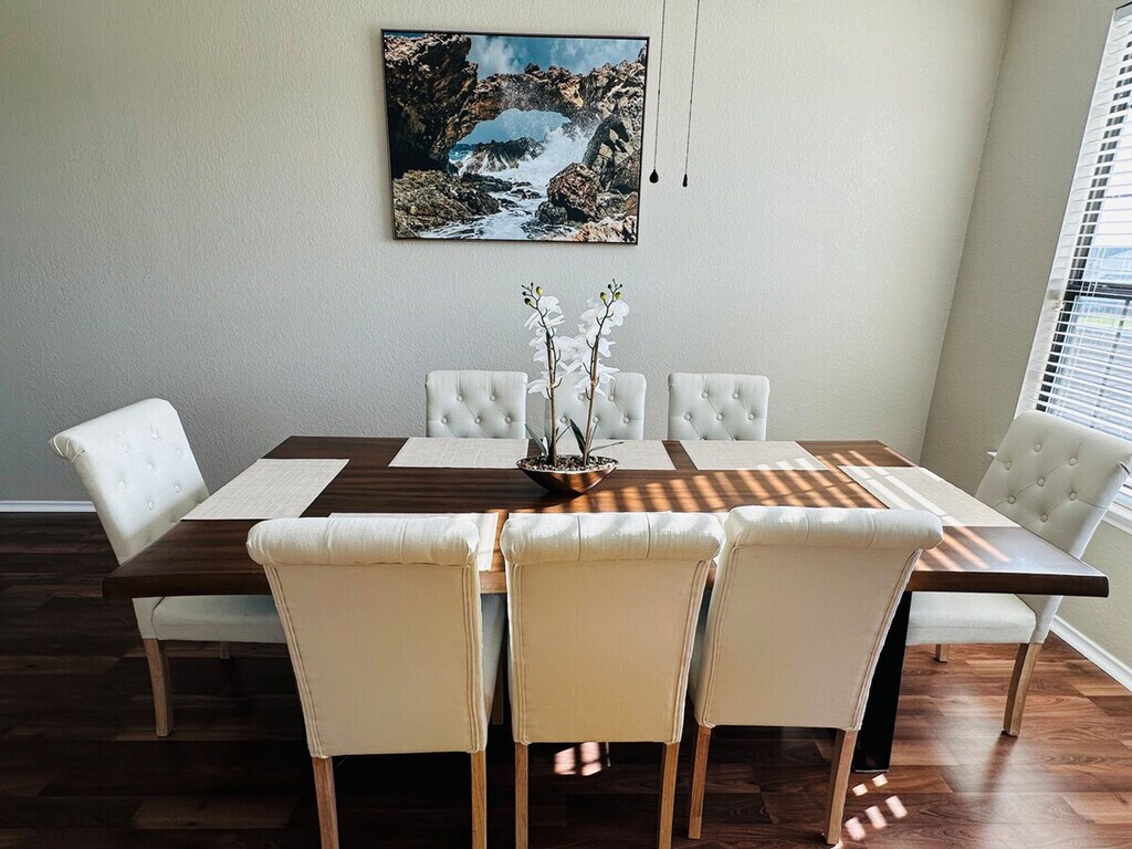 Feel at home in this stunning 4-bedroom haven in Round Rock, perfect for groups or families seeking a stylish and functional escape. Step inside and be greeted by an open floor plan bathed in natural light, effortlessly blending sleek modern design with cozy comfort. Whip up gourmet meals in the fully equipped kitchen, then gather around the spacious dining table. Unwind in one of the two inviting living areas, each boasting a large-screen TV. The spa-like bathrooms feature fluffy towels and essential toiletries, and the master suite pampers you with a luxurious bathtub and shower. Step outside and soak up the Texas sunshine in the private fenced backyard, perfect for barbecues, games, or simply relaxing under the open sky. This beautifully appointed home is conveniently located near all the best that Round Rock has to offer, from family-friendly attractions to delicious restaurants and vibrant nightlife. For everyone's safety and security, there are cameras installed in the following outdoor areas: garage, front yard, side yard, deck/patio areas, steps, and backyard. Additionally, there are door and window sensors, as well as motion sensors, inside the property. Work remotely in style with dedicated workstations in each room, ensuring seamless productivity even on vacation. [SI]