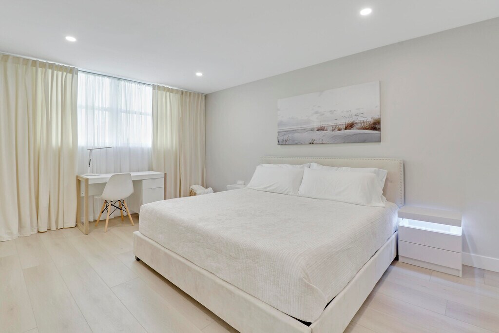 Welcome to this impeccably renovated and fully furnished 1BR/1.5BA condo in highly desired Le Chateau. This stunning residence features an open, high-end kitchen, premium finishes, designer furnishings, housewares, and impact windows. Simply unpack and enjoy! Relax on your private patio offering peaceful northern ocean views. The community is directly on the gorgeous beach and offers a beachfront pool, fitness center, game room, and more. Covered reserved parking included. Spend your winter in luxury--available mid/late December through March 2026. Minimum 90-day rental.