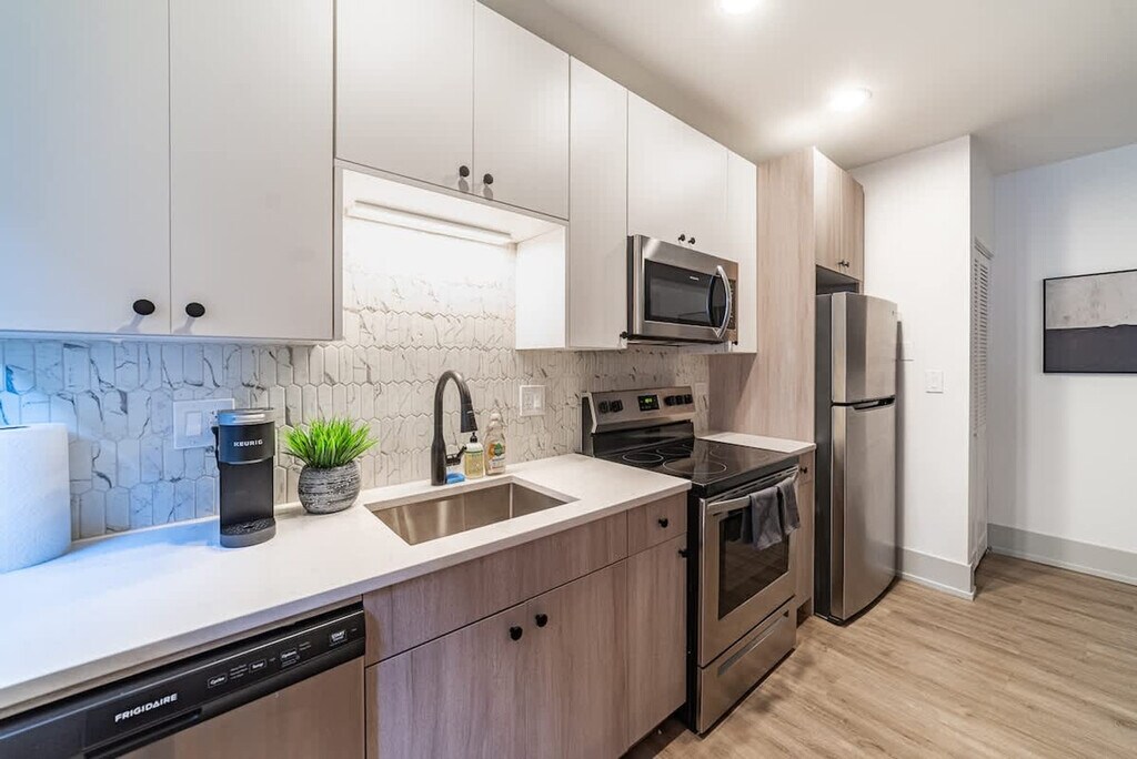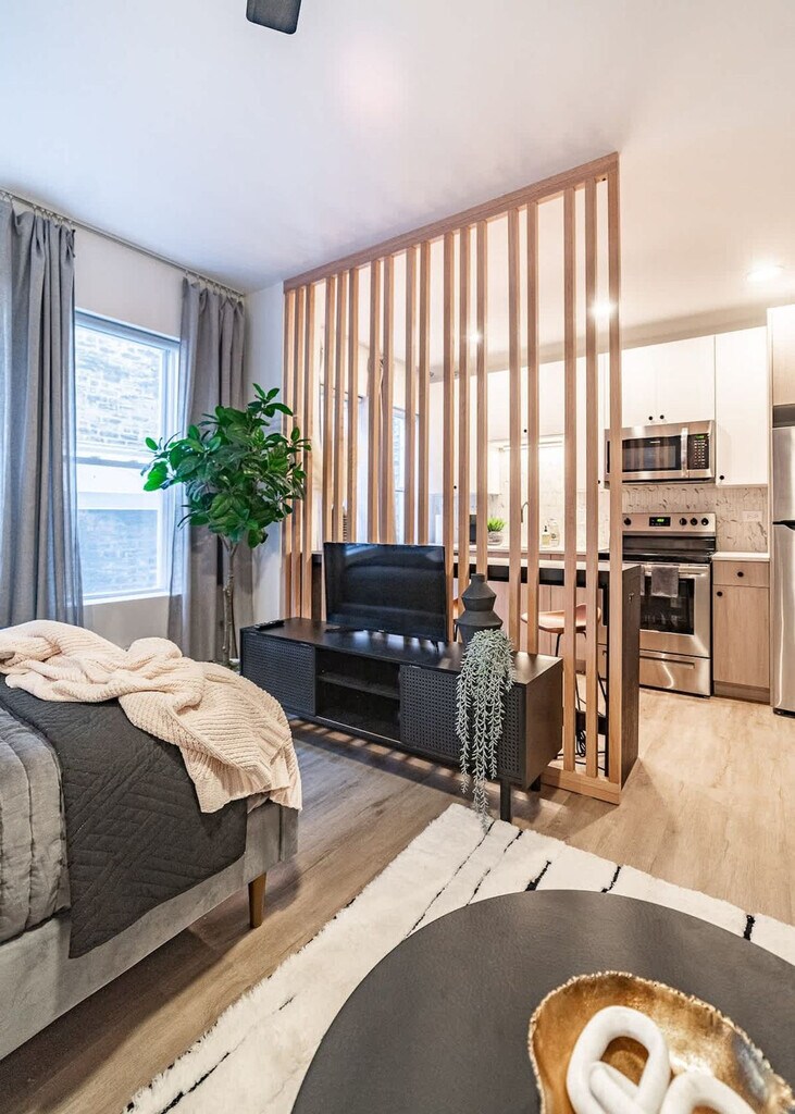 Feel at home in this beautifully remodeled studio apartment in Chicago's iconic Lakeview neighborhood. Situated at the intersection of Southport and Addison, the location couldn't possibly be better. This private studio apartment was artfully designed with a modern aesthetic and features luxury LVT flooring throughout. Inside, you'll find a modern bathroom with a spa-style stand-up shower, a breakfast nook with a built-in charger for your devices, and an in-unit washer and dryer. Relax on the plush sofa and enjoy the smart TV (no cable). Parking is not included, but it is highly recommended to use SpotHero to reserve a spot nearby before you arrive. During your stay as our guest, you receive free access to The Metropolitan, a chic members-only club located on the 66th and 67th floors of the Willis Tower. They have co-working space with gorgeous views overlooking Chicago, a bar with food and drinks all day, and a top-notch dining experience at The Craftsman restaurant. Countless trendy dining options, bars, and shops are just steps away, as well as the Southport Brown Line 'L' station, which links you directly to O'Hare. Excellent public transit directions from this apartment to any point in the city are available via web search. The apartment is a short walk from the Southport “L” train station. Check-in begins at 4 p.m. on your check-in date, and check-out ends at 11 a.m. on your check-out date. There is no smoking of any kind in the unit, and there will be an automatic $500 cleaning fee if there is any smoke smell inside. Quiet hours are from 10 p.m. to 8 a.m. There is an automatic $100 late check-out charge if you're still in the property 20 minutes after check-out. USPS mail deliveries are not allowed during your stay. A $35 admin fee will be charged to return lost items. [SI]