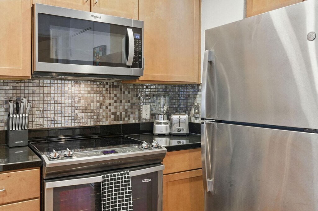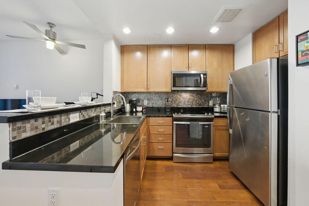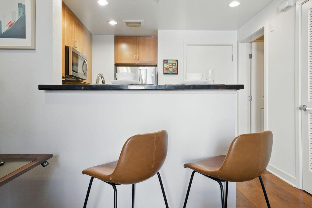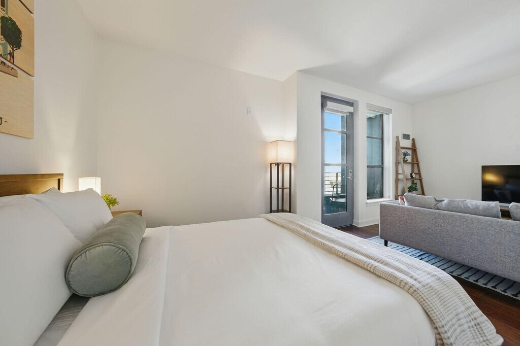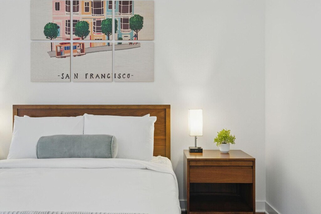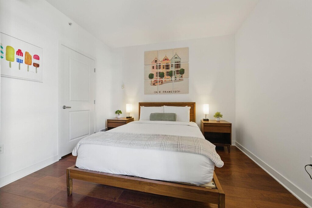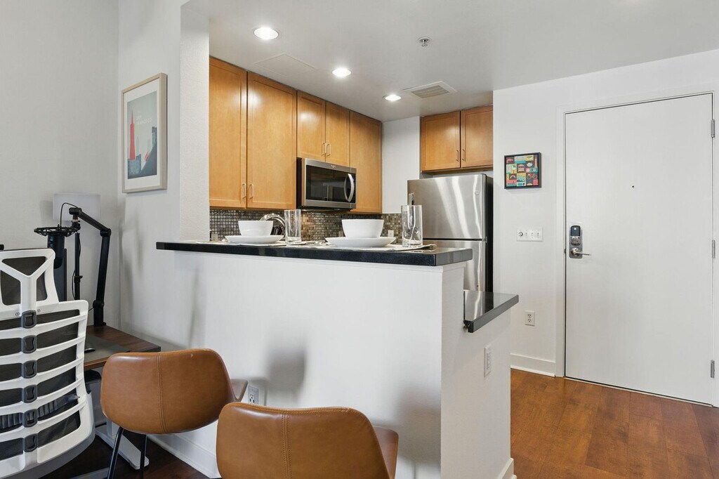 Feel at home in this fully furnished studio apartment in the heart of Mission Bay at Edgewater Apartments, offering upscale community living with modern conveniences and sophisticated design, just steps from San Francisco’s waterfront. This apartment is custom designed for the remote worker and includes a fully equipped kitchen, full bathroom, queen-size bed, ample storage, smart TV, stainless steel appliances, granite countertops and tile backsplash, wood plank flooring, in-unit washer and dryer, and a dishwasher. Residents can also enjoy access to a fitness center, co-working space and private conference rooms, a resident lounge, three landscaped courtyards with firepits and BBQs, a jacuzzi, secure package lockers, bike storage, controlled-access building, and on-site maintenance. Secure garage parking is available upon request and subject to fees, based on availability. Discover scenic trails, top-rated restaurants, cultural venues, and parks—all within walking distance. There is no air conditioning in this apartment. Internet speeds are not guaranteed and may fluctuate based on your computer model and the router location. Includes private high-speed internet, a standing desk, an ergonomic work chair, a 34-inch ultra-wide monitor, a microphone, a webcam, computer speakers, an LED streaming light, a keyboard, a mouse, a laptop stand, and a docking station. A laptop computer is not included. Partners reserve the right to conduct secure ID verification, background checks and request Proof of Income. Guests will have 24 hours to complete these steps. Booking confirmation is contingent upon the successful completion of these checks, as well as meeting the minimum eligibility requirements. [SI]