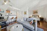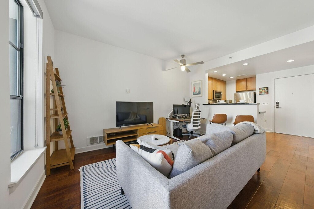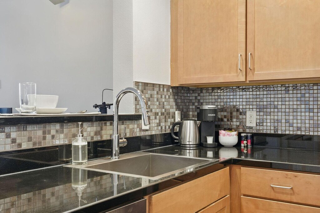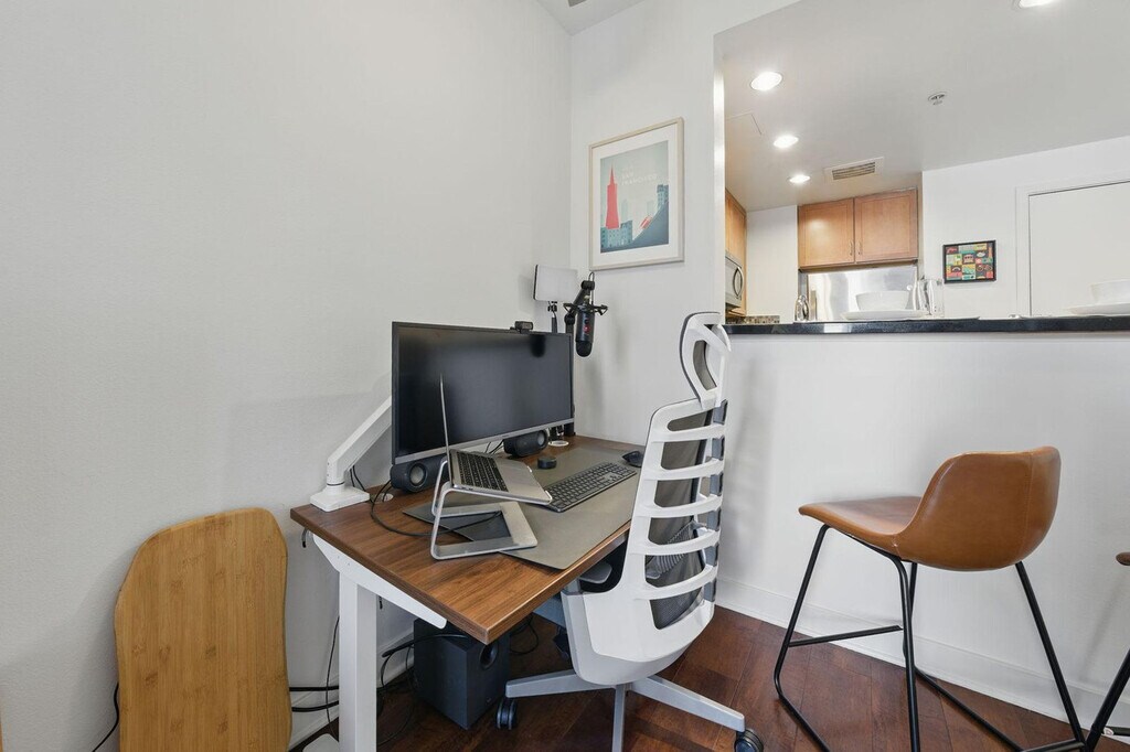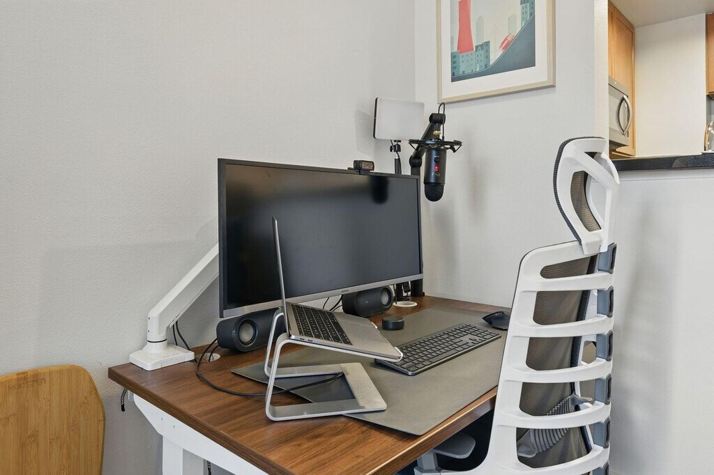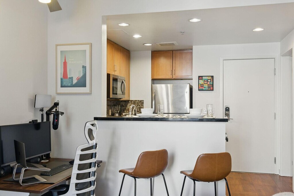 Feel at home in this fully furnished studio apartment in the heart of Mission Bay at Edgewater Apartments, offering upscale community living with modern conveniences and a prime location just steps from San Francisco’s waterfront. This apartment is custom designed for the remote worker looking for a comfortable and inspiring environment. The unit includes a fully equipped kitchen, a full bathroom, ample storage, a smart TV, all utilities, stainless steel appliances, granite countertops and tile backsplash, wood plank flooring, and an in-unit washer and dryer. Secure garage parking is available upon request and subject to fees, based on availability. Discover scenic trails, top-rated restaurants, cultural venues, and parks—all within walking distance. The building offers a 24-hour fitness center, Connect co-working lounge, resident lounge, three landscaped courtyards with firepits and BBQs, and a jacuzzi. There is no air conditioning in this unit. Internet speeds are not guaranteed and may fluctuate based on your computer model and the router location. A laptop computer is not included in the home office set-up. Includes private high-speed internet, standing desk (Uplift), ergonomic work chair (Uplift), 34-inch ultra-wide monitor (Samsung), microphone (Blue Yeti), webcam (Logitech), computer speakers (Bose), LED streaming light, keyboard (Logitech), mouse (Logitech), laptop stand, and TOTU 16-in-1 Triple Display USB-C 3.1 Docking Station. Partners reserve the right to conduct secure ID verification, background checks and request Proof of Income. Guests will have 24 hours to complete these steps. Booking confirmation is contingent upon the successful completion of these checks, as well as meeting the minimum eligibility requirements. [SI]