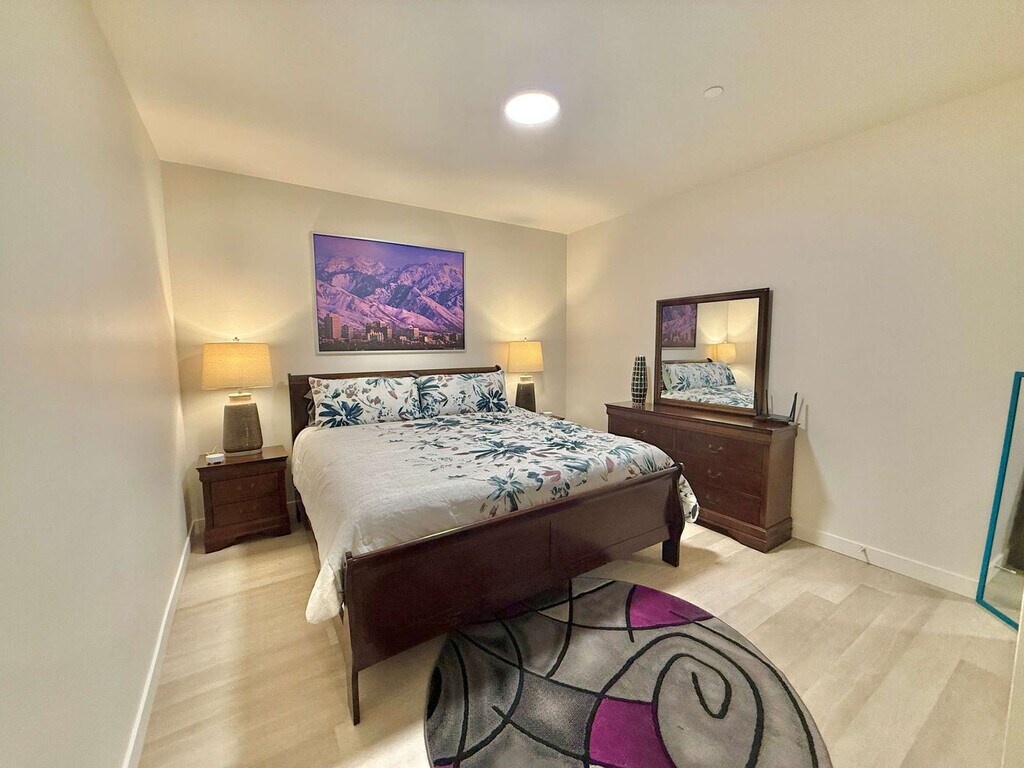 Feel at home in this stunning 2-bedroom, 2-bathroom ultra-luxury apartment in the vibrant heart of downtown Salt Lake City. This ultra-modern space features unique decor and high-end finishes. The spacious living area includes plush furnishings and large windows with city skyline views. The full-sized kitchen is equipped with top-of-the-line appliances and cookware. Enjoy watching television on one of two smart TVs with streaming services. The master bedroom is a serene oasis with a luxurious king-size bed, premium linens, and a full-sized en-suite bathroom with a spa-like feel. The second bedroom offers a plush queen-size bed and its own full bathroom. A patio overlooks the rooftop pool area, which doubles as a refreshing pool in the summer and a relaxing hot tub in the winter. The building also features a dog spa, a deluxe fitness center, and an 8th-floor speakeasy club room with 360-degree views of the city skyline. One free parking space is provided in the building for vehicles up to 196" long, 82" tall, and 80" wide. A travel crib (pack n' play), a baby high-chair, a self-inflating deluxe twin bed kit, and a baby stroller can be provided free of charge on request. Additional cribs, high-chairs, or beds can be provided, but each may incur an additional cost. Located in the walkable Gateway District, this downtown gem provides easy access to dining, shopping, and entertainment options. Explore nearby attractions such as the Salt Lake City Public Library, the City Creek Center, and the lively nightlife. Dogs are welcome, but no cats are allowed, and any other type of animal needs to be approved ahead of time. If your vehicle does not fit in the provided parking space or if you need a second parking spot, there is inexpensive parking less than a block away that you can pay for. Last-minute requests for baby furniture are not guaranteed. [SI]