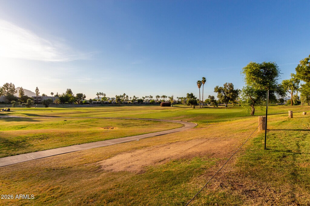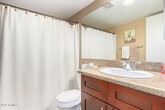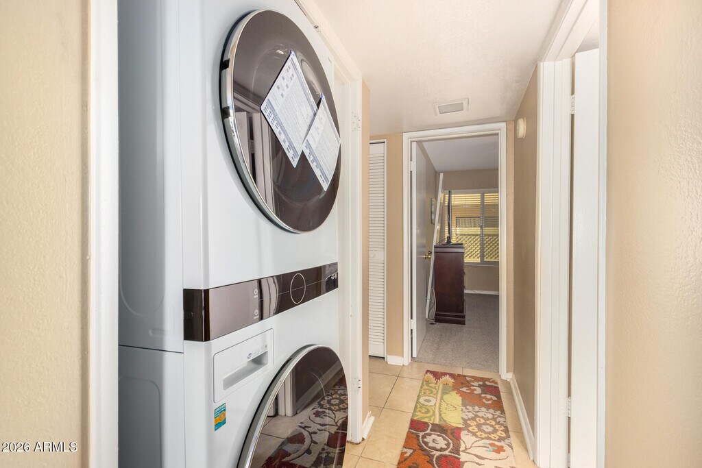 Move-in ready and fully equipped,this second-floor unit offers convenient single-level living. Wood flooring runs through the living room,dining area,and bedrooms,with vaulted ceilings and a neutral color scheme throughout. The living room opens to a private balcony. The galley-style kitchen features cherry cabinets,granite countertops,and black appliances. Stackable washer and dryer are located inside the unit for added convenience. The spacious primary bedroom includes a three-quarter bath,and a full hallway bath serves the second bedroom and guests. Conveniently located near shopping,dining,entertainment,sports venues,and easy access to Loop 101.