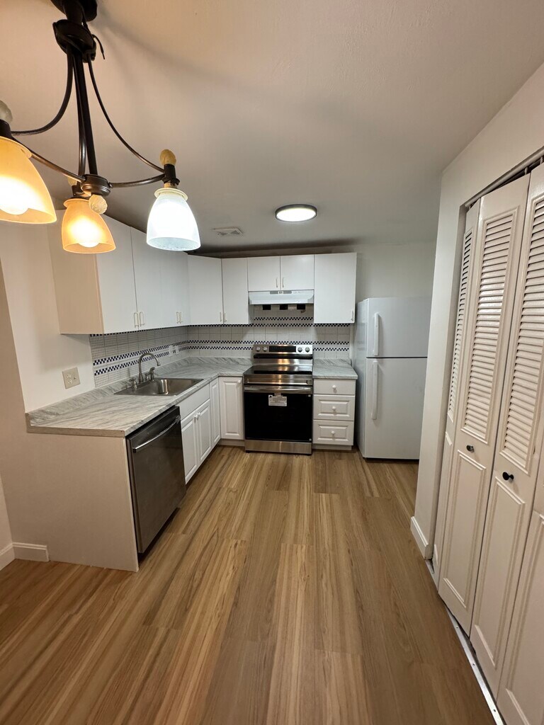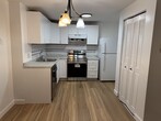 Just renovated with all new kitchen, and bathroom! Heat and hot water included. Dishwasher, spacious, One parking spot off street included. No dogs. Carpeted, laundry in building.