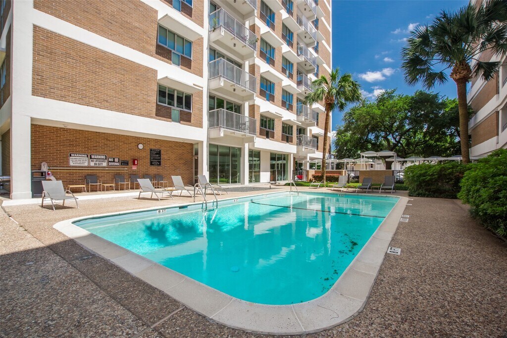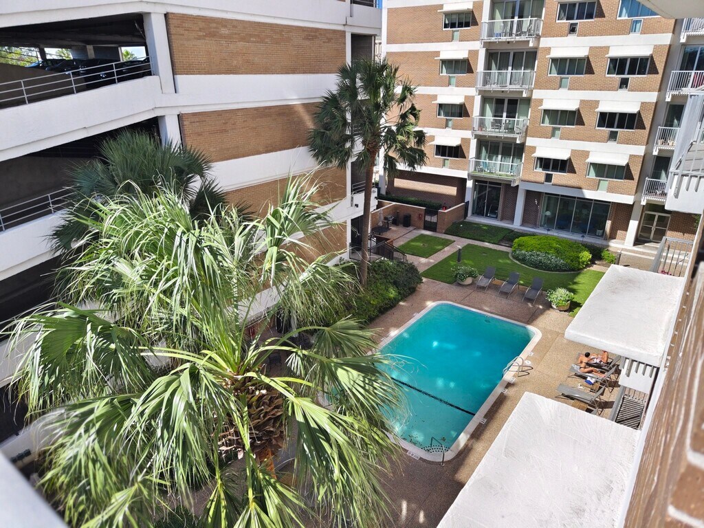 Fantastic Montrose Mid-Century Condo landmark. Updated 1/1 located on the 10th floor with awesome city views from your private balcony. Open floor plan with lots of natural light,bamboo hardwood floors,quartz countertops,stainless steel appliances,interior walls just painted. Kitchen includes wine/beverage cooler,industrial style faucet and pendant lighting over eat-in peninsula island. Bathroom has walk-in shower w/frameless glass enclosure. Washer/Dryer included in apartment. Enjoy living on tree-lined Montrose Blvd. On site work out room and pool. Conveniently located to restaurants,local shopping,Menil Collection,Museum District,Universities,Downtown and much more. All bills included except internet and expanded cable. Controlled parking access. Don't miss this great condo. HOA has pet weight limit. MLS# 10874500