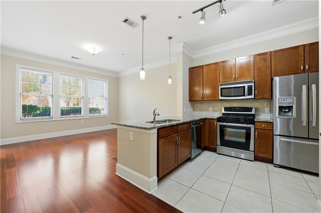 Welcome home to The Residences at Vinings Main,Unit #2115! This isn't just a condo; it's your entry into a vibrant,walkable,"live-work-play" community. As you step inside this meticulously maintained 1-bedroom,1-bathroom residence,you are greeted by 10-foot ceilings and gleaming hardwood floors that flow through the open-concept living space. Entertain with ease from your modern kitchen,complete with stainless steel appliances,rich granite counters,and a breakfast bar. This space overlooks both a separate dining area and a spacious living room. Slide open the doors to your private,covered balcony,your personal oasis overlooking the lush landscaping and shimmering resort-style pool. Retreat to the oversized primary suite,which features a large walk-in closet and a spa-like in-suite bath with a deep soaking tub and a separate shower. This unit is truly move-in ready,freshly painted and includes a washer and dryer. The luxury continues beyond your front door. Vinings Main offers unparalleled amenities: a 16/7/365 concierge,a state-of-the-art fitness center,a sparkling pool with grilling station,a club room with a catering kitchen,and a guest suite. This home offers rare convenience. It includes a secure garage parking space and a separate storage unit. Best of all,it provides true,stepless,ground-level living—your car is just steps from your front door. Leave your car behind and walk to the Vinings Jubilee for farmers markets,coffee,shopping,and dining. This is the perfect,"lock-and-go" lifestyle you’ve been searching for. Don't miss your chance to live in Historic Vinings Village. Listing Agent is owner/agent licensed in the State of Georgia and acting as principal.