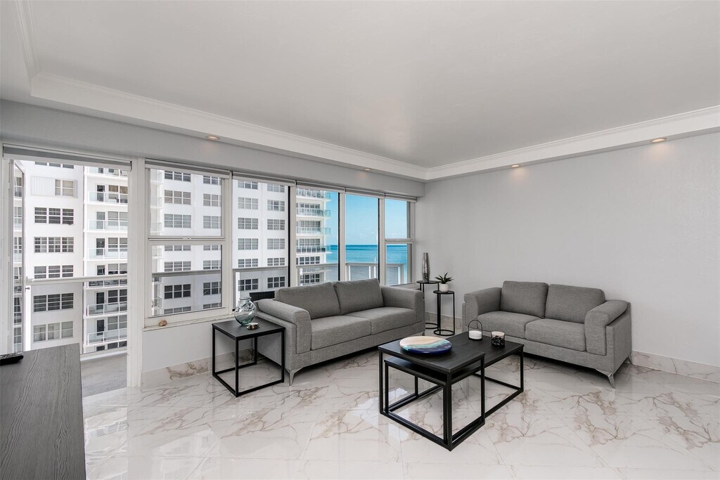 Courtesy of Keller Williams Realty Services Posted by Andrew Coleman with EXP Realty . Turnkey Corporate Rental | Furnished 3BR/2BA | Oceanfront Galt Mile. Bright, spacious, furnished and renovated corner unit. Ocean view from dining area. Features updated kitchen with granite countertops and stainless steel appliances, impact windows, glass balconies, custom window treatments, and tasteful furnishings. Comfortable sleeping arrangements: Primary bedroom with king bed, second bedroom with king, third bedroom with two twins. Spa-style primary bath with jet spray shower. Walkable and centrally located near restaurants, shops, grocery, pharmacy, and entertainment. Well-managed building with doorman, valet/self parking (up to 2 spaces), pool, BBQ deck, gym, club area, and private beach access. Building has undergone recent structural renovations.