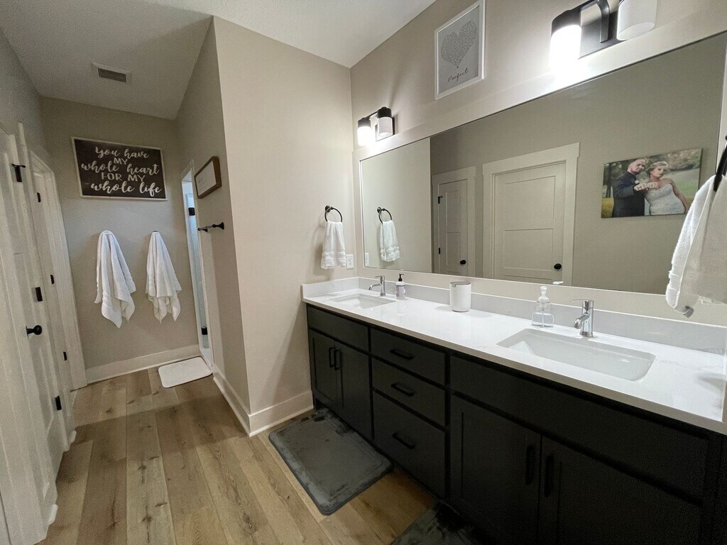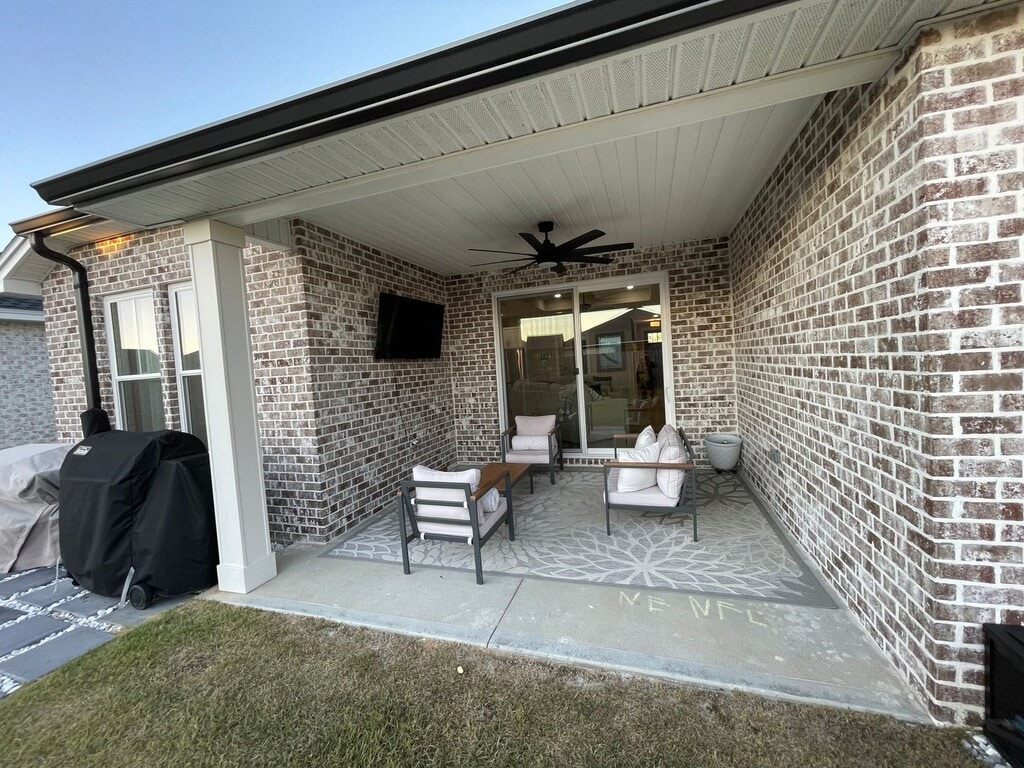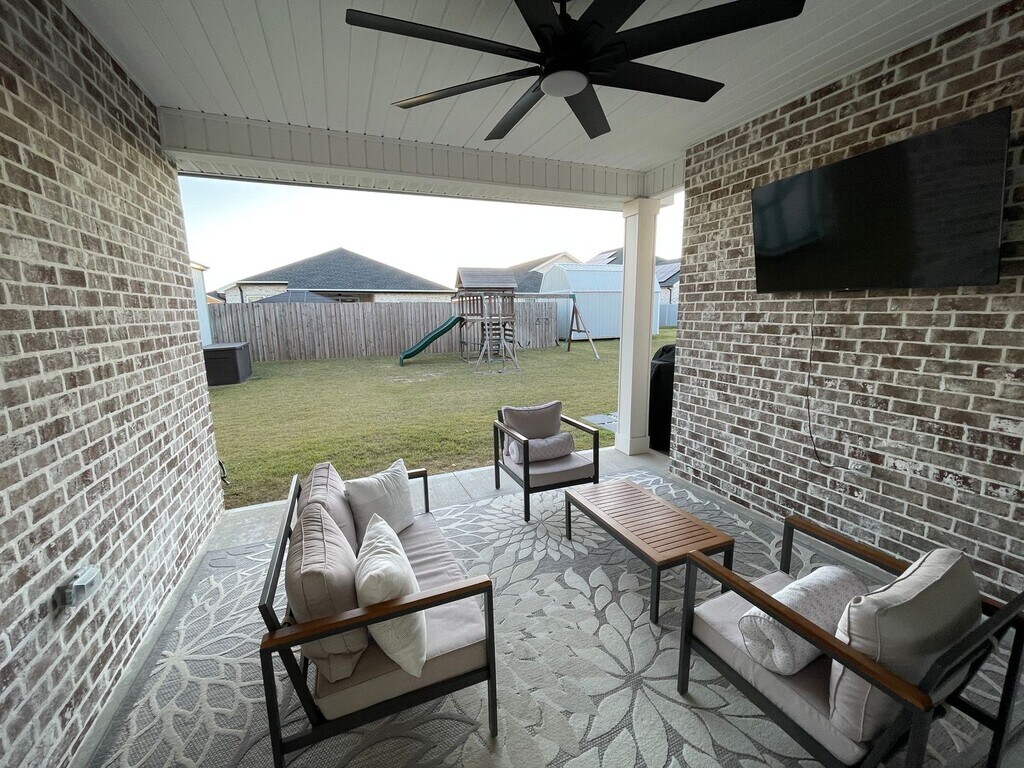 For Lease - Coastal 4 BR/2.5 BA home built by Camden Homes in 2024 (Cambridge plan). This split bedroom, open-concept design features a spacious kitchen with quartz countertops, large island, Energy Star stainless appliances, and custom pantry shelving for small appliances. The primary suite offers trey ceiling, double vanities, walk-in shower, and a custom closet. Enjoy a covered back patio with TV mount and dedicated grilling station. Washer and dryer are included in the mud room, which features a custom drop zone for easy storage. Beautifully appointed for comfortable coastal living. **Pets negotiable with $250 pet deposit, $50 pet fee, $50 monthly pet rent per pet.