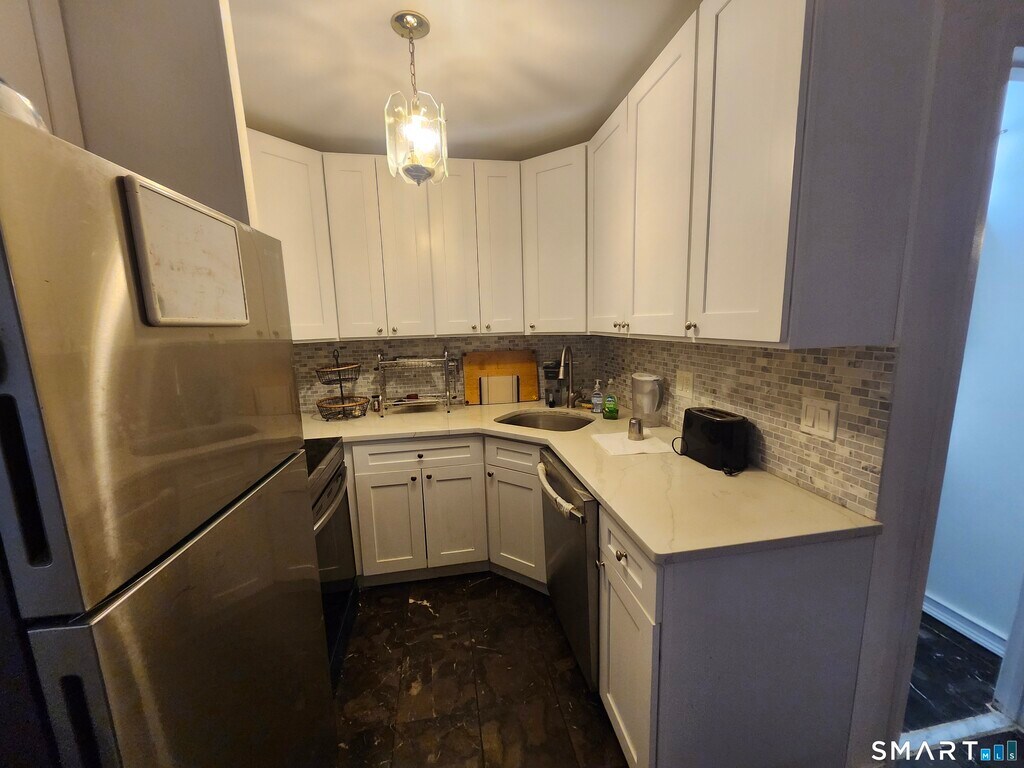 Take a look at this first-floor ranch-style condo featuring 2 bedrooms and 1.5 baths. The kitchen offers stainless steel appliances, quartz countertops, and granite flooring, with a convenient adjoining dining area. Enjoy an open layout with a spacious living room and bamboo floors throughout. Bathrooms are updated, and a new washer and dryer add extra convenience, along with ample storage. Step outside to easy pool access, plus one parking space. Ideally located near restaurants, shopping, public transportation, and downtown Norwalk-complete with a nearby playground and grilling area.
