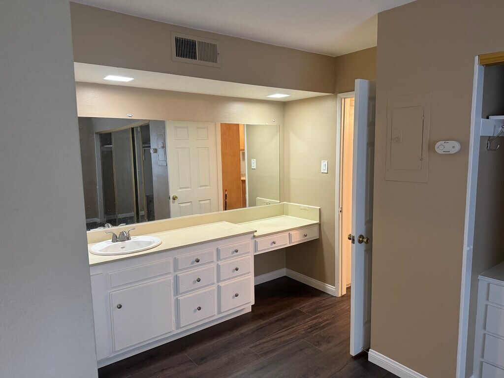 Spacious one bedroom unit with new flooring and paint throughout, microwave, wood cabinets & dishwasher. The vanity area is separate from the bathroom and has lots of built-in cabinets and closet space. The unit has central A/C and heating, plus a large enclosed shaded patio and is located in the park area on the first floor of the condo complex. There is a covered parking spot with a possible additional reserved spot near the entrance. Close to shopping, downtown, freeways, and Cal State Fullerton. Laundry facility, large pool & jacuzzi, gym, and community center onsite.