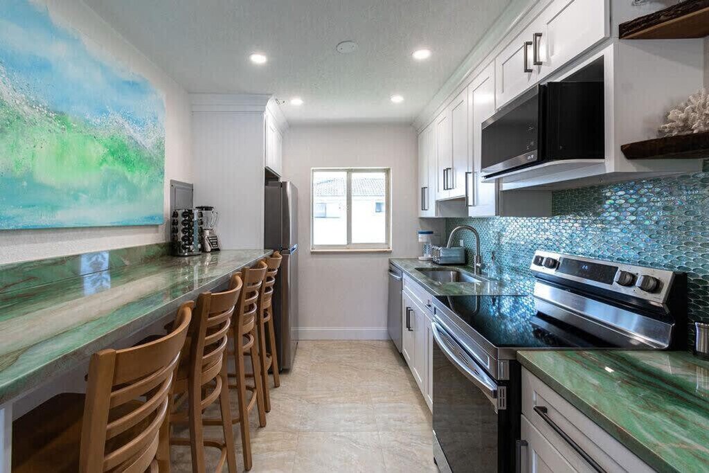 Feel at home in this galactic-themed 2-bedroom apartment at 400 South, located on the first floor of an 8-unit building. This sparkling clean apartment has been newly renovated and features brand new furniture. Unit A includes a modern bathroom with a walk-in shower. Each bedroom provides ample closet space, while the bathroom includes a vanity with extra storage space in the closet adjacent to the door. The common areas offer plenty of sunlight, highlighting beautiful features like chic marble flooring, playful galactic decor, and brand new furniture and appliances, including a dishwasher. The inviting kitchen is fully stocked with a Milky Way breakfast bar providing seating for four. In the lounge area, you'll find a leather couch and two armchairs to kick back and stream your favorite show on the Smart TV. Only dogs are allowed at this property, with a fee of $100 per pet, per stay. Located just outside historic downtown Cocoa Beach on one of its popular local beachfront streets, you'll be in perfect proximity to the ocean, just 50 steps from your front door. It's a 5-minute walk to downtown and across the street from Orlando's closest beach and minutes south of the Kennedy Space Center at the famed Space Coast. The surrounding neighborhood is beautiful, with a gated community directly across the street and million-dollar mansions all around. Located on A1A with Uber and Lyft being very prevalent in the area. Mailbox access is not available for guests. To ensure a comfortable start to your stay, an initial stock of paper towels, toilet paper, tissues, coffee pods, creamer, sugar, light cleaning supplies, garbage bags, sponges, dish soap, and dishwasher tabs is provided. Please plan to replenish these items as needed during your stay. Laundry soap is not provided. [SI]