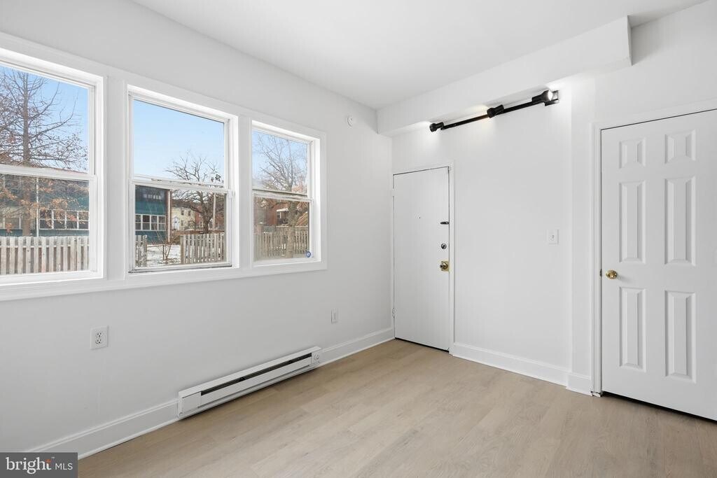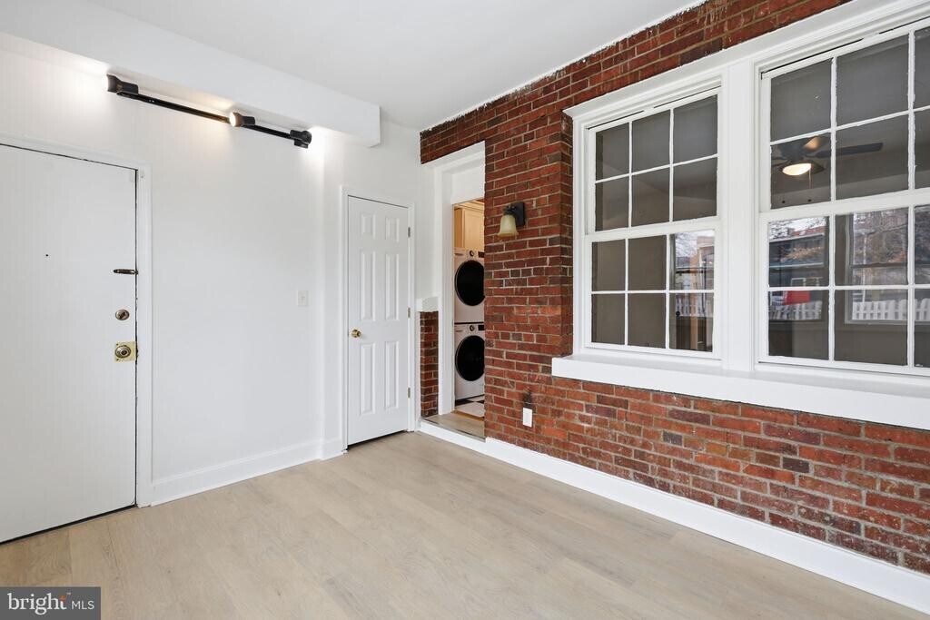 Beautifully remodeled two-bedroom, one-bath apartment in a boutique four-unit building located in the highly desirable Brookland neighborhood. Warm and cozy, this home offers a highly walkable yet private and quiet setting, just a half-mile (10-minute walk) to the Brookland Metro and moments from neighborhood cafés, pubs, and local favorites. The unit blends a modern renovation with original charm, featuring hardwood floors throughout, freshly painted interiors, and new contemporary light fixtures. Large windows fill the space with abundant natural light, creating an inviting and comfortable atmosphere. The updated kitchen showcases white cabinetry, butcher block countertops, open wood shelving for added storage, stainless steel appliances, and gas cooking, offering both style and functionality. The bathroom has been thoughtfully renovated with a classic white subway tile shower, new vanity, and tile flooring, combining clean, timeless finishes with modern convenience. Additional highlights include in-unit laundry and thoughtful storage throughout. Residents enjoy access to a large shared backyard, ideal for relaxing, entertaining, or enjoying outdoor space in a peaceful setting.