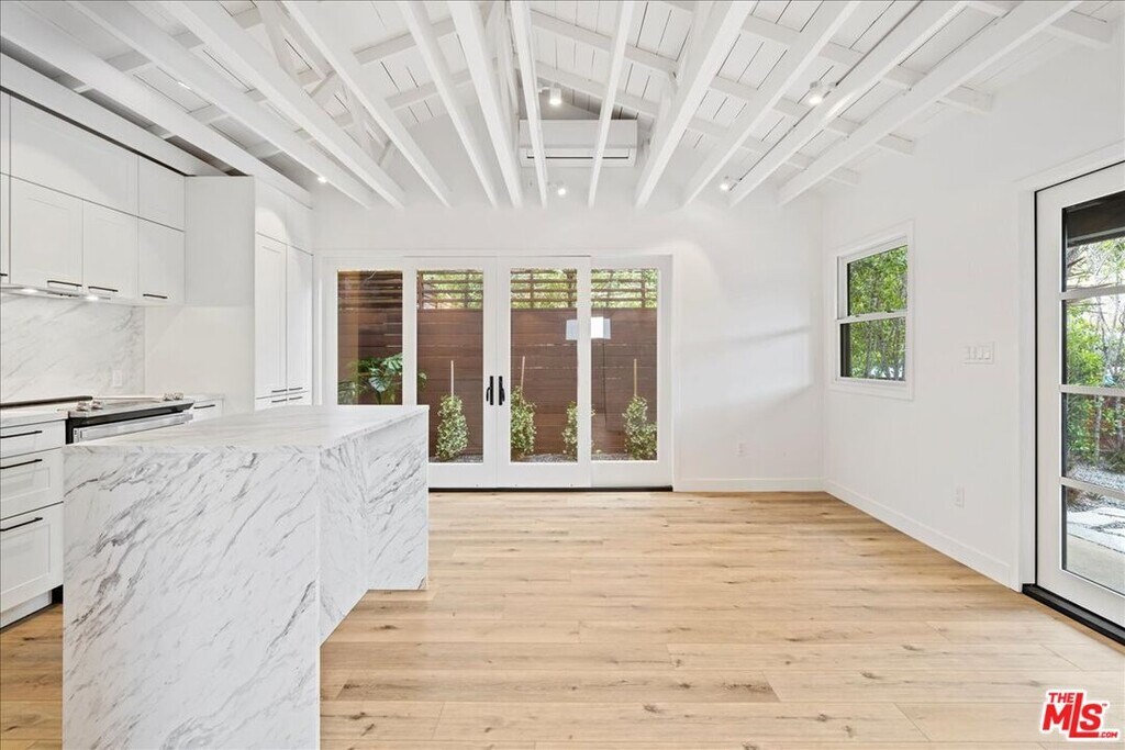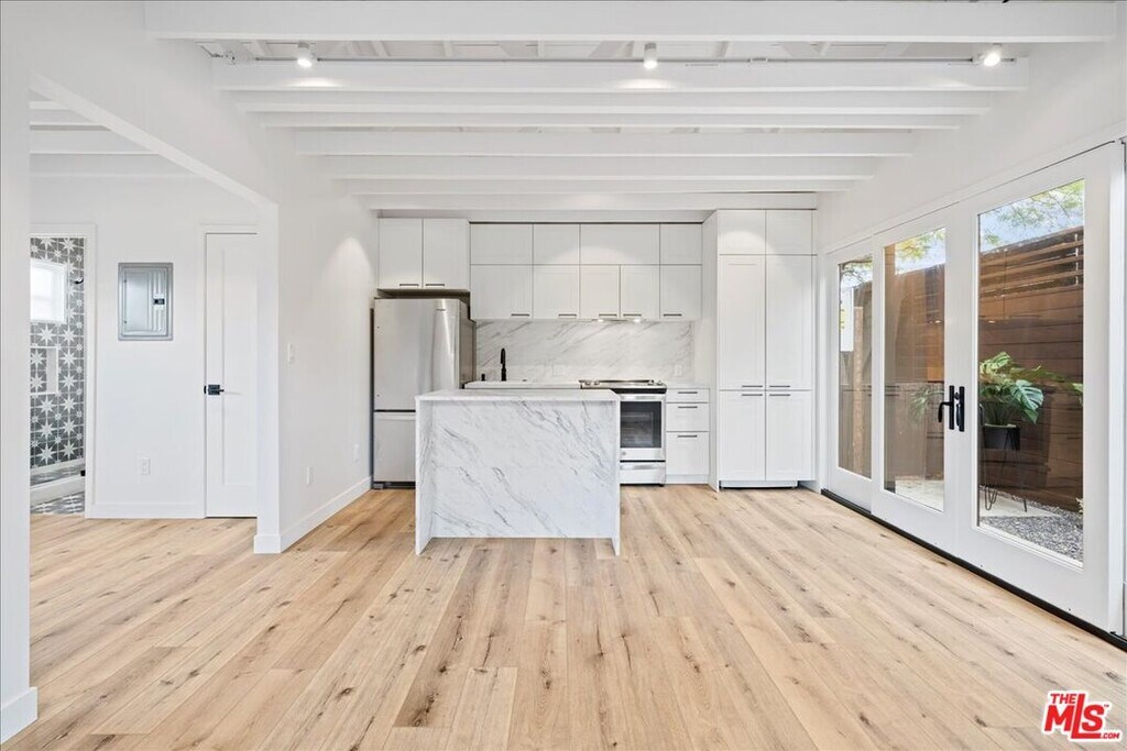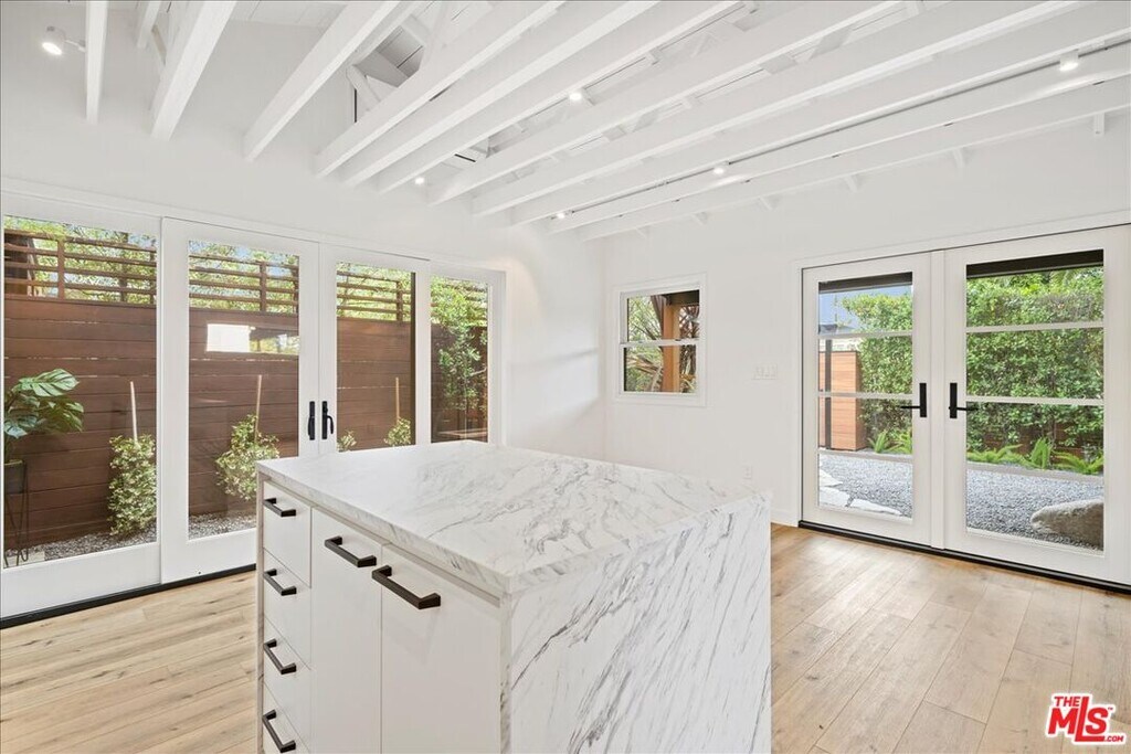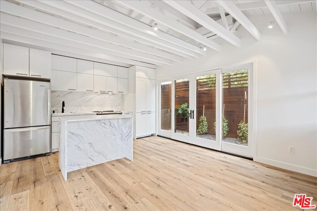 This wonderfully remodeled 1 bed 1 bath is nestled in a prime area of Del Rey. Completely new & designed with high end taste & touches. A living area that is open & bright with 2 sets of French doors, leading out to an inviting private yard to the East & patio to the North. A wonderful combination of indoor/outdoor living. The spacious yard is adorned by a gorgeous palm tree where on the side is an ideal patio area for grilling, chilling & planting. The en-suite bedroom is separated by a barn door to make it all one room or closed to be private. It too has french doors that lead to the yard. The open ceiling with finished rafters, plus center island provide a comfortable dining / living environment. Brand new upright, full size washer & dryer, fridge w/ ice maker electric stove with Luxury vinyl/stone floors plus A/C. This is a front unit in a duplex of a well-designed modern masterpiece with its own private & secure entrance. A quiet & central neighborhood where close by you can step around the corner & visit numerous trendy (Michelin star rated) restaurants & bars. Approximately 1 mile to the beach & all that Venice, Marina Del Rey & Culver City have to offer. Prefer a long-term tenant but will consider short term. Outdoor space is 700 sq ft. MLS# 25620243