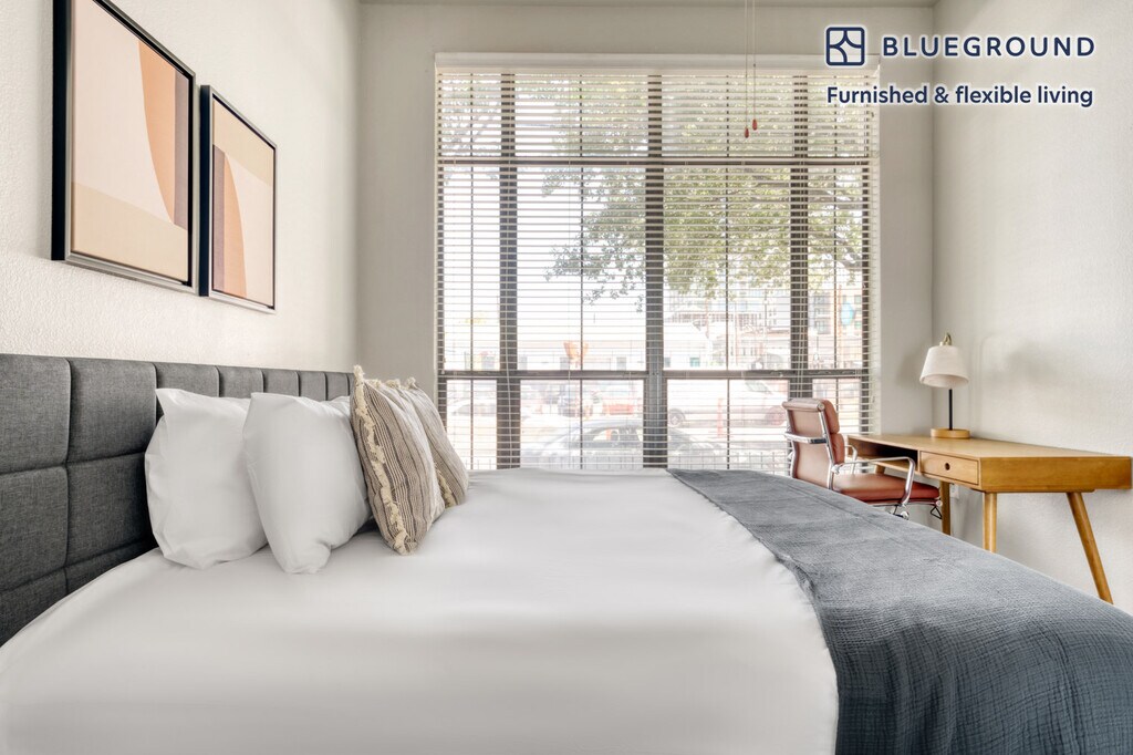 Feel at home wherever you choose to live with Blueground. You’ll love this pretty Downtown Austin furnished one bedroom apartment with its modern decor, fully equipped kitchen, and roomy living room. Ideally located, you’re close to all the best that Austin has to offer! (ID #ATX102) The advertised rate of $1,480/month is the lowest available price, based on a 2 month(s) and 29 day(s) stay with a move-in date of November 25, 2025. If you’re looking for a 1-year stay, the rate is $2,590/month. Rates vary depending on the duration of stay, season, and other parameters. For exact pricing and additional pricing components, please visit our website and enter your desired move-in and move-out dates. The rate is applicable when billed upfront; it can be higher if billed in multiple payments. Brokers are welcome to reach out. Were you looking for an unfurnished lease? Try Blueground instead and upgrade from unfurnished to furnished living: - Furnished at rates comparable to unfurnished - No setup or furniture costs - save thousands - Move-in ready - save time, just bring your suitcase Designed with you in mind As with any Blueground apartment, you’ll find a thoughtfully designed space complete with beautiful furniture and a fully equipped kitchen in this one bedroom property. And, thanks to our superior quality mattresses, luxury linens, and towels, you can relax knowing you’ll always feel comfortably at home. When you’re ready for some fun, you can take in the Austin vibes or bring the entertainment to you with the premium wireless speaker or smart TV. This apartment also offers in-apartment laundry. Sleeping arrangements King Bed, 70.8in/180cm Amenities Building amenities unique to this one bedroom apartment include an on-site: - BBQ Area - Dryer - Elevator - Swimming pool - Washing machine - Parking - Pets allowed Arrival and ongoing support The entire apartment is yours to enjoy! Throughout your stay, you’ll have access to our Client Experience team through the Blueground App. You can schedule additional cleanings, submit maintenance requests, and view our neighborhood recommendations with just a few taps. We’ll share all details upon confirmation of your stay. Other things to note Building amenities may have an extra cost. This Blueground apartment has flexible lease options, allowing you to book it for one month, a year, or more. Pets are welcome, though weight limits and breed restrictions apply and may incur fees. Parking is offered based on availability and is subject to a fee. We take great pride in ensuring every photo displayed is shot in our own units with our actual furnishings. That said, we regularly refresh our decor and furniture arrangement, which may differ from what’s pictured. Also note - This apartment faces the street - Noise from the nearby nightlife can sometimes be heard late at night [GO]