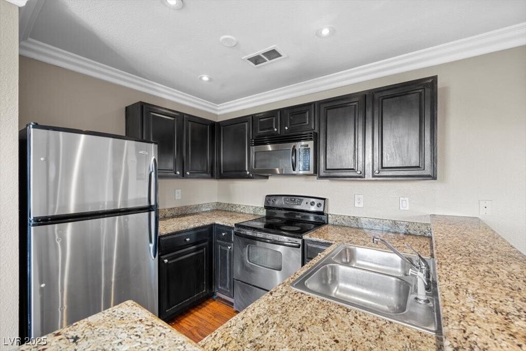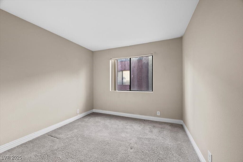 Step into luxury living just minutes away from the vibrant Las Vegas Strip, Las Vegas Airport and UNLV! This beautiful property offers the perfect blend of convenience, comfort, and style. Enter the second story condo to be greeted by a cozy open floor plan that's ideal for relaxing or entertaining. Natural warm light floods in through the sliding glass doors. Step to the balcony for a stunning view of the pool and hot tub below, creating a serene backdrop. This has a cozy one bedroom with sofa bed. Dining table, bar w stools and a granite kitchen. Plush carpeting that's 2025 new. The community is gated for added security.