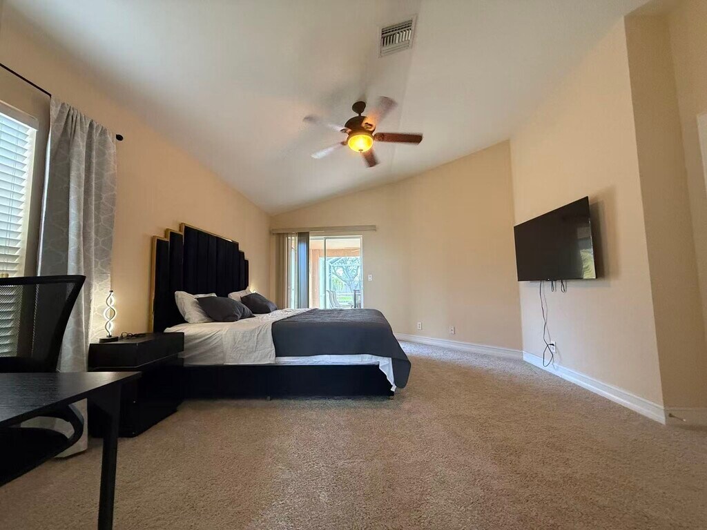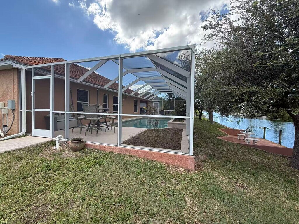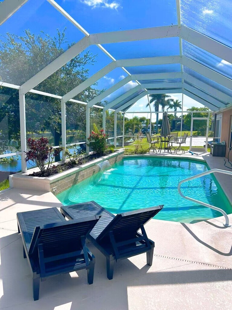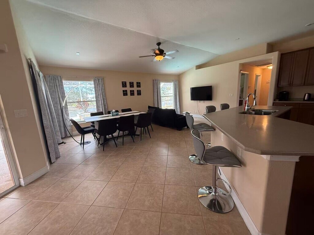 Welcome to Villa Sunset kiss Escape to a captivating 4-bedroom, 2-bathroom oasis, where modern comfort meets the irresistible charm of Florida. Villa Sunset kiss thoughtfully designed for effortless relaxation, ensuring every guest experiences the perfect coastal getaway. Located on miles of serene freshwater canals, this stunning villa offers a tranquil waterside setting, perfect for unwinding and embracing nature. With gorgeous western sunset views, every evening is a breathtaking spectacle, inviting you to soak in Florida’s golden hues. Tucked away in the highly sought-after SW Cape Coral, this retreat places you just minutes from premier shopping, dining, golf courses, airports, and sun-drenched beaches. Whether you're savoring the serenity of the spacious interiors or exploring the vibrant surroundings, your dream Florida escape begins here! Bright & Inviting Living Room – A Space for Everyone Designed for togetherness, this open-concept living area lets everyone stay connected, whether relaxing, chatting, or enjoying entertainment. Sink into plush seating and unwind in front of the large flat-screen TV, perfect for movie nights or catching up on your favorite shows. Sliding glass doors open to the lanai, allowing the Florida sunshine to stream in and create a seamless indoor-outdoor experience. Fully Equipped Kitchen – A Culinary Haven Cook up delicious meals with ease in this well-stocked kitchen, thoughtfully designed for both convenience and style. Whether preparing a quick snack or a full-course dinner, you’ll find all the essentials at your fingertips. Start your morning right with your choice of a traditional coUee maker or Keurig, perfect for crafting the perfect cup. Adjacent to the kitchen, a charming breakfast nook invites you to savor peaceful mornings, while the integrated breakfast bar with seating for four creates the perfect space for casual dining or lively conversations over a fresh meal. Elegant Master Suite – A Private Oasis Retreat to the luxurious master suite, where comfort meets style. The king-size bed invites restful nights, while the flat-screen TV provides entertainment at your fingertips. Wake up to serene views of the pool, creating a tranquil ambiance for relaxation. Indulge in a spa-like bathroom experience, featuring a soaking jacuzzi tub, a spacious walk-in shower, and a dual-sink vanity perfect for unwinding after a sun-filled day. Comfortable Guest Bedrooms & Convenient Poolside Bathroom Each guest bedroom offers a cozy retreat, ensuring comfort for everyone. The first guest bedroom features a plush queen-size bed and ample closet space, perfect for storing both your wardrobe and your latest shopping finds. The second guest bedroom is ideal for friends or family, furnished with two twin beds, creating a restful and welcoming space. Designed with little adventurers in mind, the third guest bedroom boasts two bunk beds, The guest and poolside bathroom provides easy access and convenience, complete with a single-sink vanity and refreshing shower, making post-swim rinses effortless. This version adds warmth, fluidity, and a slight touch of excitement to make the spaces feel inviting. Let me know if you'd like further refinements or if you’d like to highlight any additional features! Outdoor Oasis – Pool, Lanai & Private Dock You'll likely spend most of your time enjoying the tranquil poolside retreat! Designed for relaxation and entertainment, this private outdoor space offers a seamless blend of comfort and Florida sunshine. Bask in the warmth with the electric-heated pool, positioned for perfect Western exposure, delivering stunning sunset views. Whether you're lounging by the water or enjoying alfresco dining, there's ample seating, including a dining table for six, a separate cozy seating area, and sun loungers for soaking up the rays. Fire up the propane grill for a poolside barbecue, then wind down with a drink at the dock by the water, where gentle breezes and peaceful surroundings create the perfect moment to relax. Whether it's day or night, this villa’s outdoor haven ensures a blissful escape!