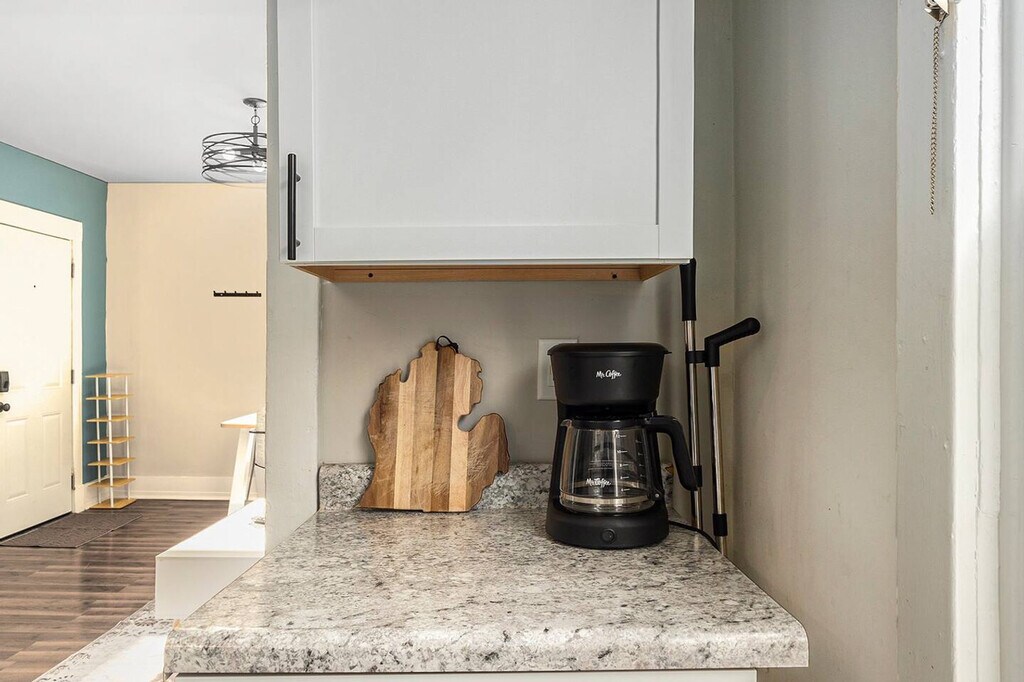 Feel at home in this renovated apartment in a safe area, less than a mile away from all hospitals on Medical Mile. This apartment is in the heart of Grand Rapids and within walking distance to many top locations. The kitchen is stocked with dishes, silverware, cups, mugs, wine glasses, pots and pans, kitchen utensils, dish soap and sponge, hand soap, garbage bags, a fire extinguisher, cleaning solution, cleaning rags, kitchen hand towels, oven mitts, leftover containers, a coffee pot, toaster, knives, a cutting board, and coffee. The bathroom is stocked with hand soap, towels, garbage bags, a hair dryer, and a first aid kit. The mattress has a mattress protector and the pillows have pillow protectors that are washed between each stay. Small dogs are allowed with a one-time $149 pet cleaning fee and $40/month/pet additional fee. This centrally located apartment is close to everything in Grand Rapids. You can be to any highway or in the heart of downtown in less than 5 minutes. There are many bus stops nearby as well as numerous electric scooters and bikes for rent across the street. Also, ride-share services are readily available throughout the city. The neighborhood is very safe with a lot to do in the area and is within walking distance to many restaurants and coffee shops. It is also a short distance from the historic 6th St Bridge. There might be some muffled white noise from the highway that you may hear from time to time. All rentals will be a minimum of 30 days. You must be 18 or older to book. [SI]